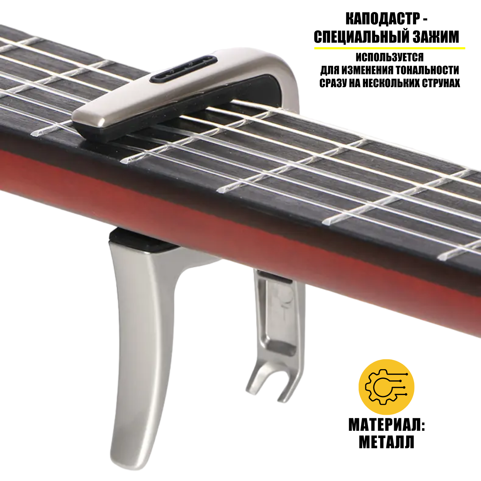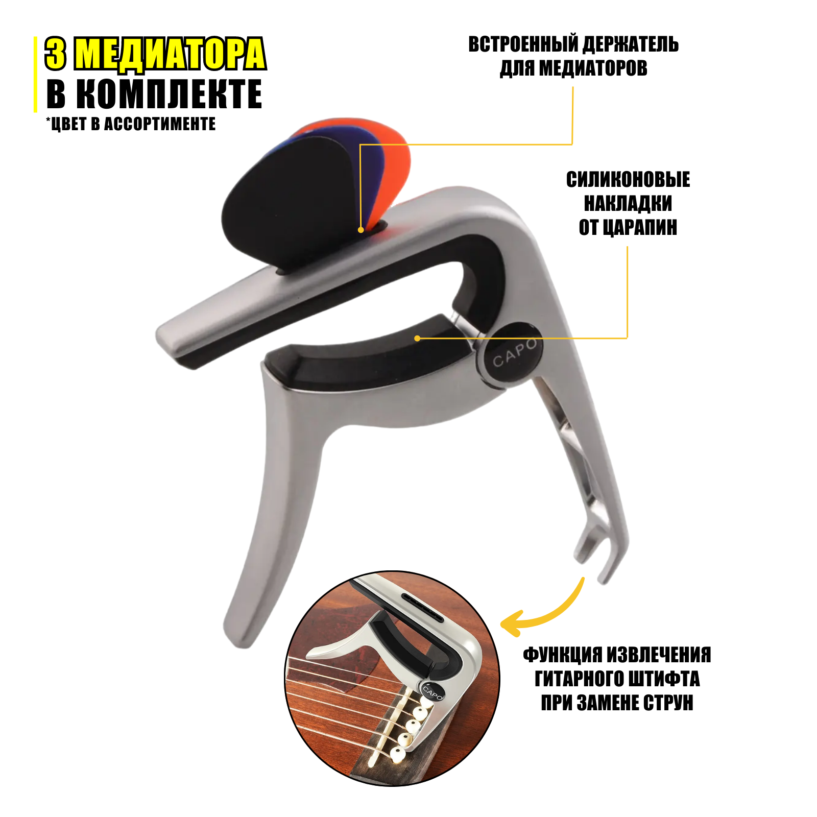 | Подробная комплектация | - каподастр - 1 шт; - медиаторы - 3 шт; - сурдина для акустической гитары - 1 шт. -напальчники силиконовые универсальные черные для игры на гитаре, размер XXS, XS, S, M, L- 5 шт; |