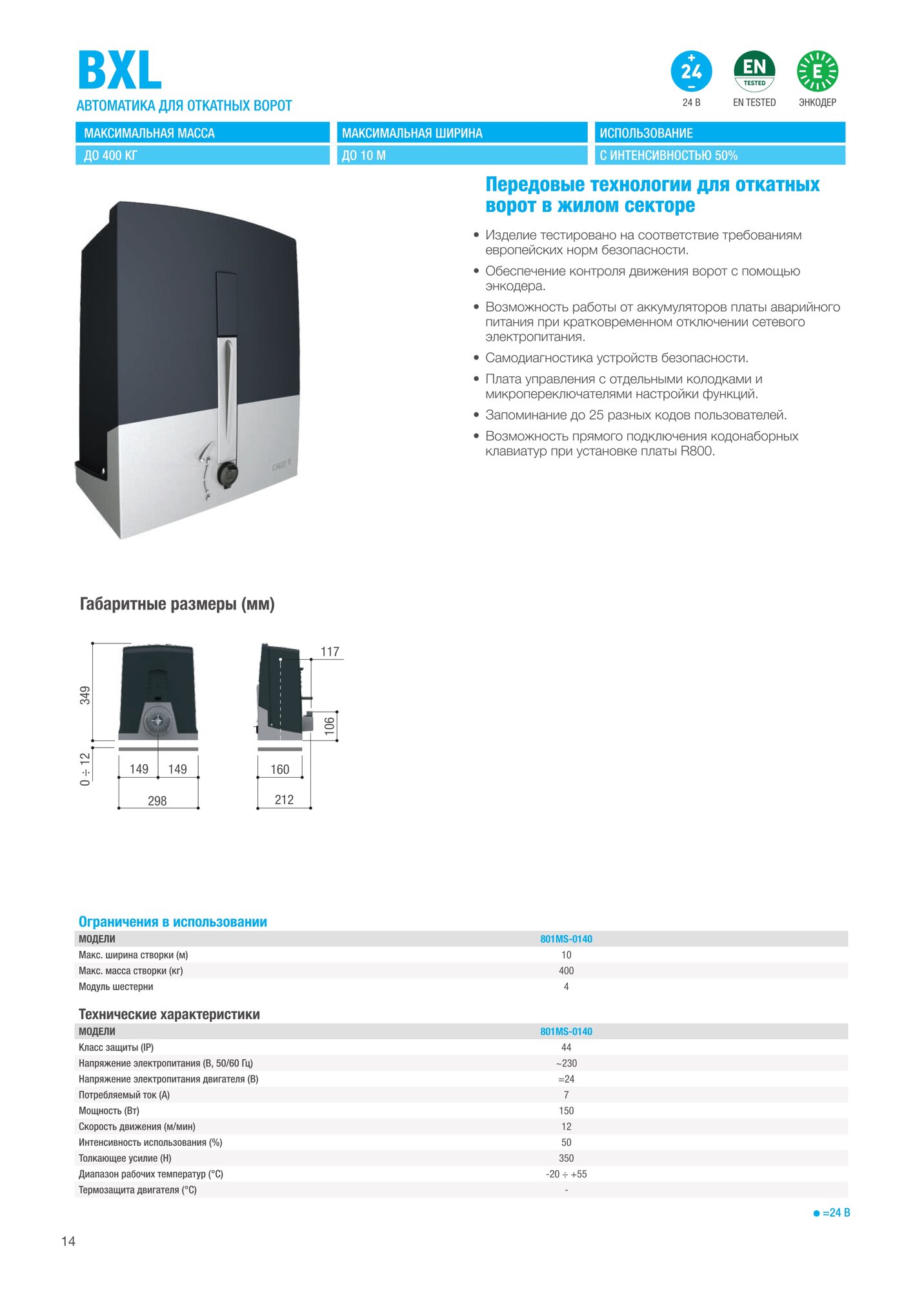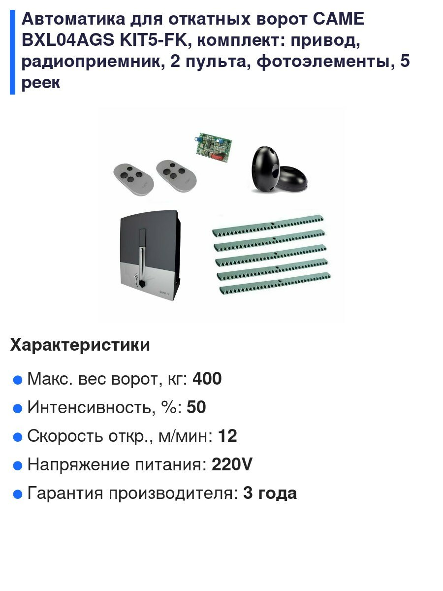 Автоматика для откатных ворот CAME BXL04AGS KIT5-FK, комплект: привод, радиоприемник, 2 пульта, фотоэлементы, 5 реек интересное: