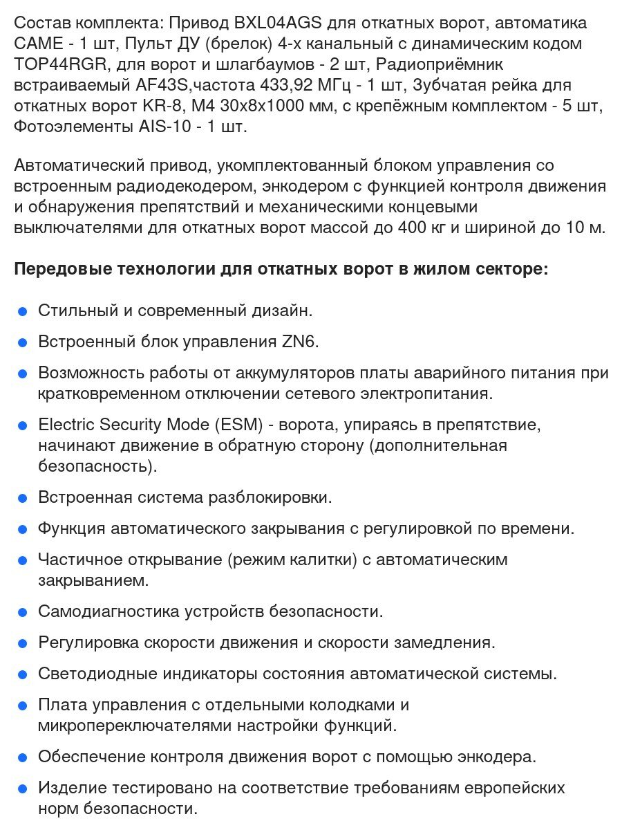 | Подробная комплектация | Привод BXL04AGS для откатных ворот, автоматика CAME - 1 шт, Пульт ДУ (брелок) TWIN2 2-х канальный, для ворот и шлагбаумов - 2 шт, Зубчатая рейка для откатных ворот KR-8, M4 30х8х1000 мм, с крепёжным комплектом - 5 шт, Радиоприёмник встраиваемый AF43S,частота 433,92 МГц - 1 шт, Фотоэлементы AIS-10 - 1 шт. |