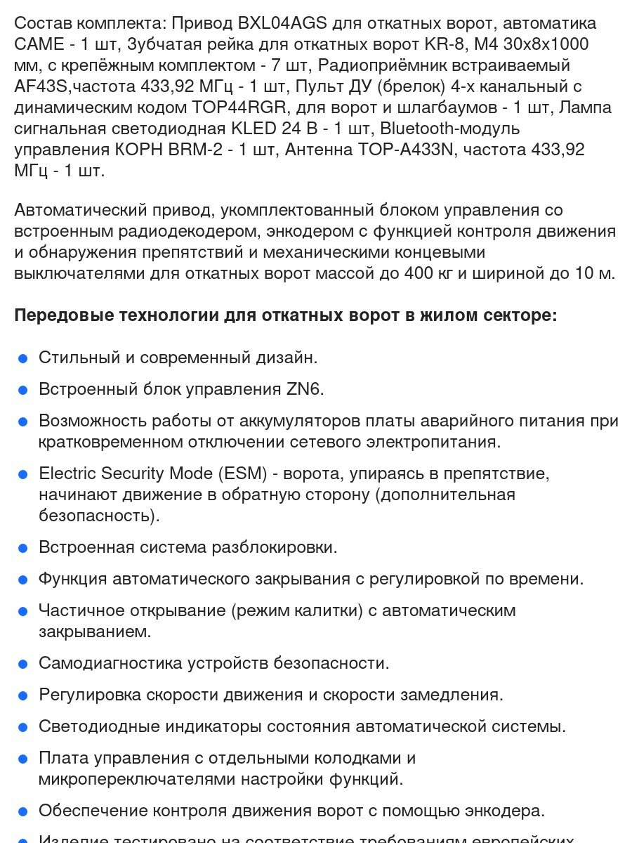 | Подробная комплектация | Привод BXL04AGS для откатных ворот, автоматика CAME - 1 шт, Зубчатая рейка для откатных ворот KR-8, M4 30х8х1000 мм, с крепёжным комплектом - 7 шт, Лампа сигнальная светодиодная KLED 24 В - 1 шт, Радиоприёмник встраиваемый AF43S,частота 433,92 МГц - 1 шт, Bluetooth-модуль управления КОРН BRM-2 - 1 шт, Пульт ДУ (брелок) TWIN2 2-х канальный, для ворот и шлагбаумов - 1 шт, Антенна TOP-A433N, частота 433,92 МГц - 1 шт. |