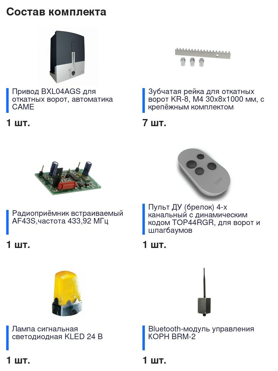 Автоматика для откатных ворот CAME BXL04AGS KIT7-L-T1-BT, комплект: привод, радиоприемник, пульт, лампа, антенна, 7 реек, Bluetooth-модуль интересное: