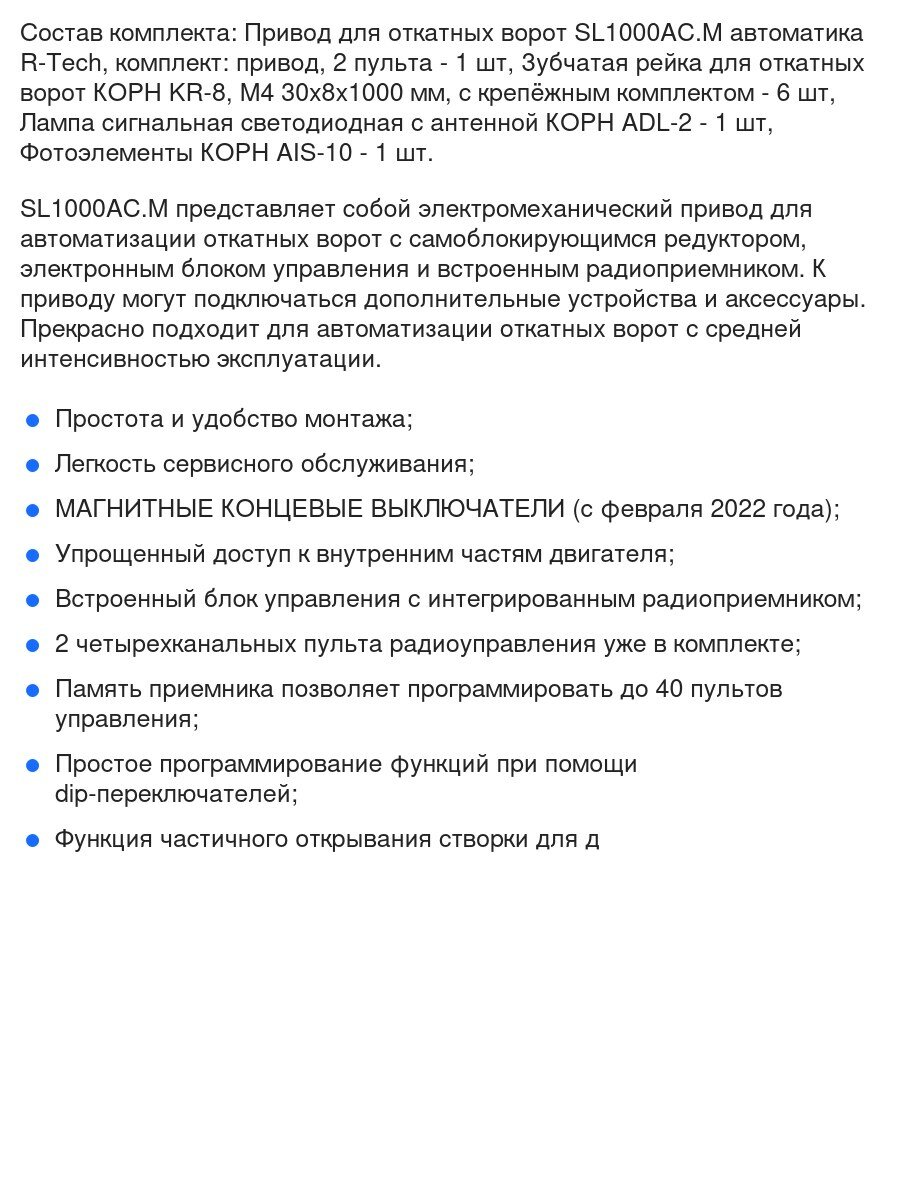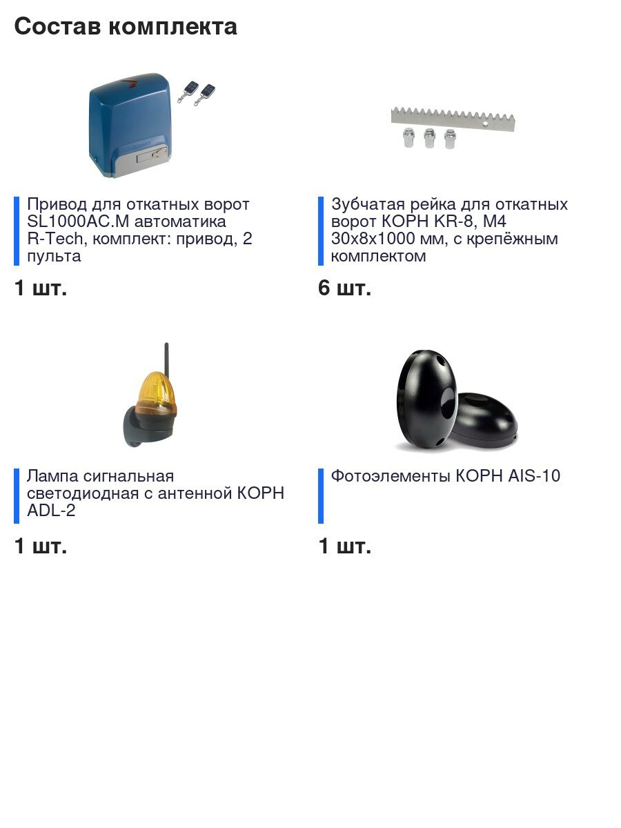 Автоматика для откатных ворот R-Tech SL1000AC.M-FULL-K6, комплект: привод, 2 пульта, фотоэлементы, лампа, 6 реек интересное: