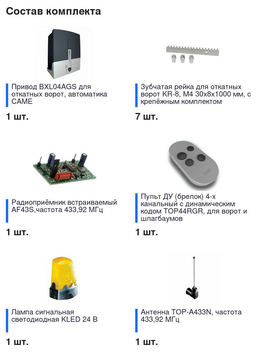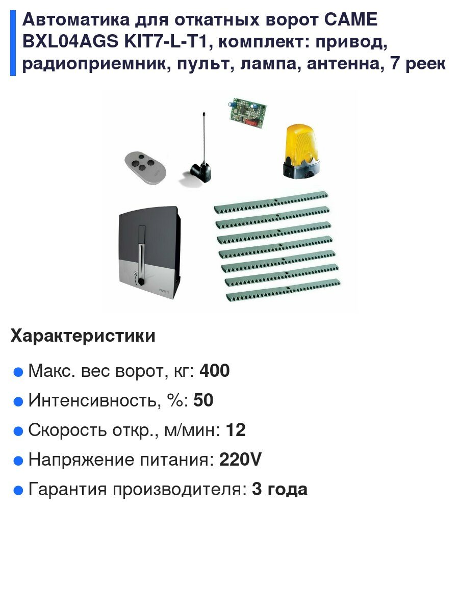 Автоматика для откатных ворот CAME BXL04AGS KIT7-L-T1, комплект: привод, радиоприемник, пульт, лампа, антенна, 7 реек интересное: