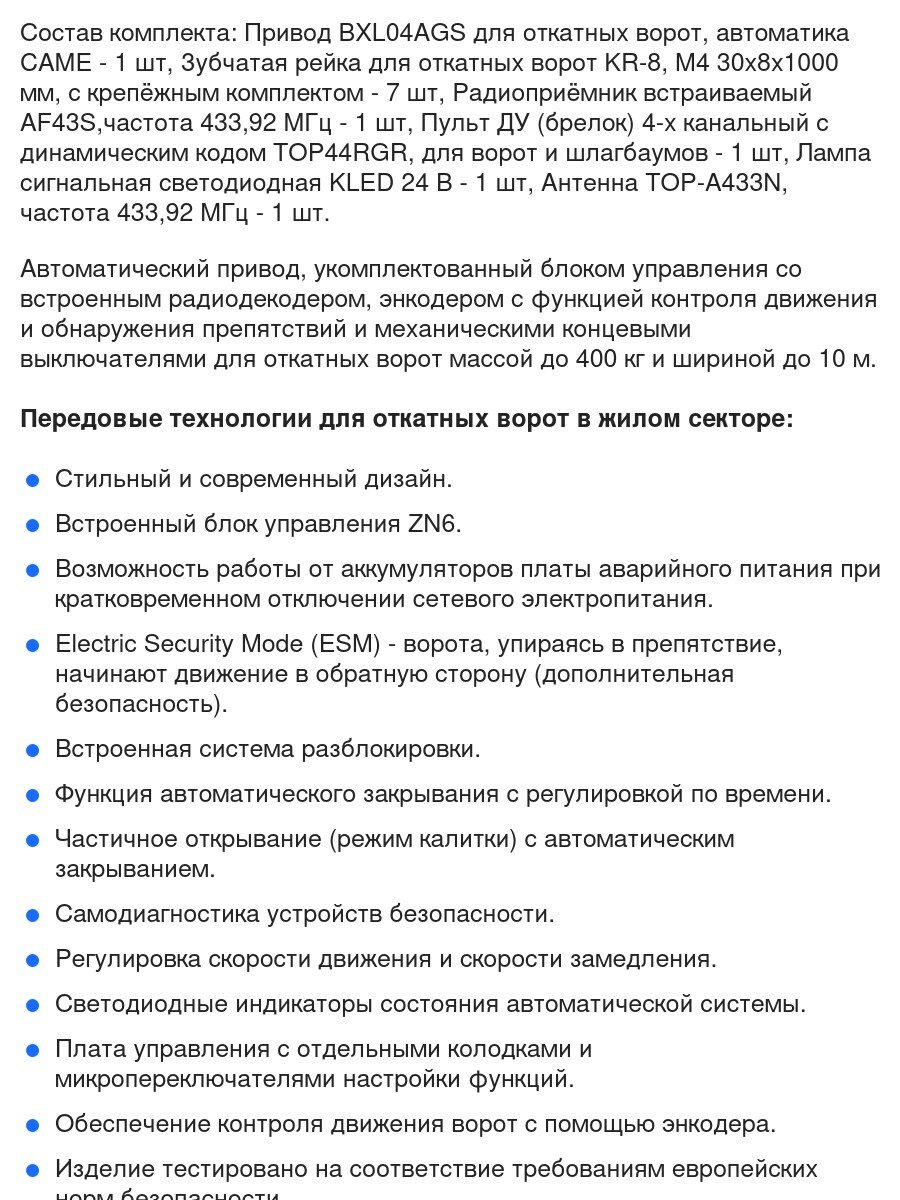 | Подробная комплектация | Привод BXL04AGS для откатных ворот, автоматика CAME - 1 шт, Зубчатая рейка для откатных ворот KR-8, M4 30х8х1000 мм, с крепёжным комплектом - 7 шт, Лампа сигнальная светодиодная KLED 24 В - 1 шт, Радиоприёмник встраиваемый AF43S,частота 433,92 МГц - 1 шт, Пульт ДУ (брелок) TWIN2 2-х канальный, для ворот и шлагбаумов - 1 шт, Антенна TOP-A433N, частота 433,92 МГц - 1 шт. |