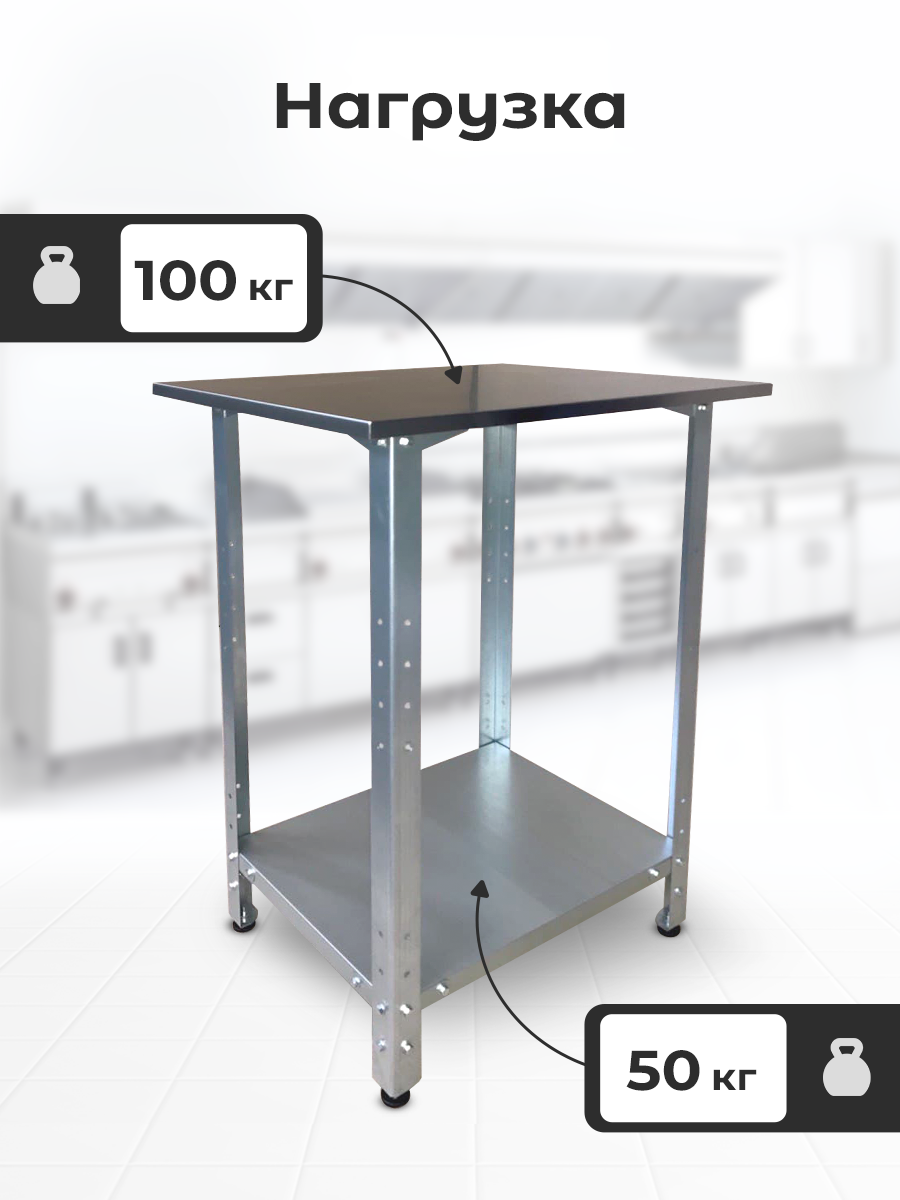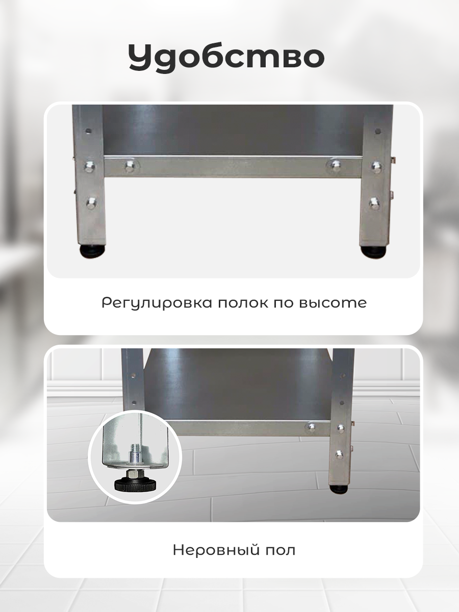 | Подробная комплектация | Столешница из нержавеющей стали 1 шт, сплошная полка из оцинкованной стали 1 шт, ножки с регулируемыми винтами 4 шт, комплект фурнитуры 1 шт |