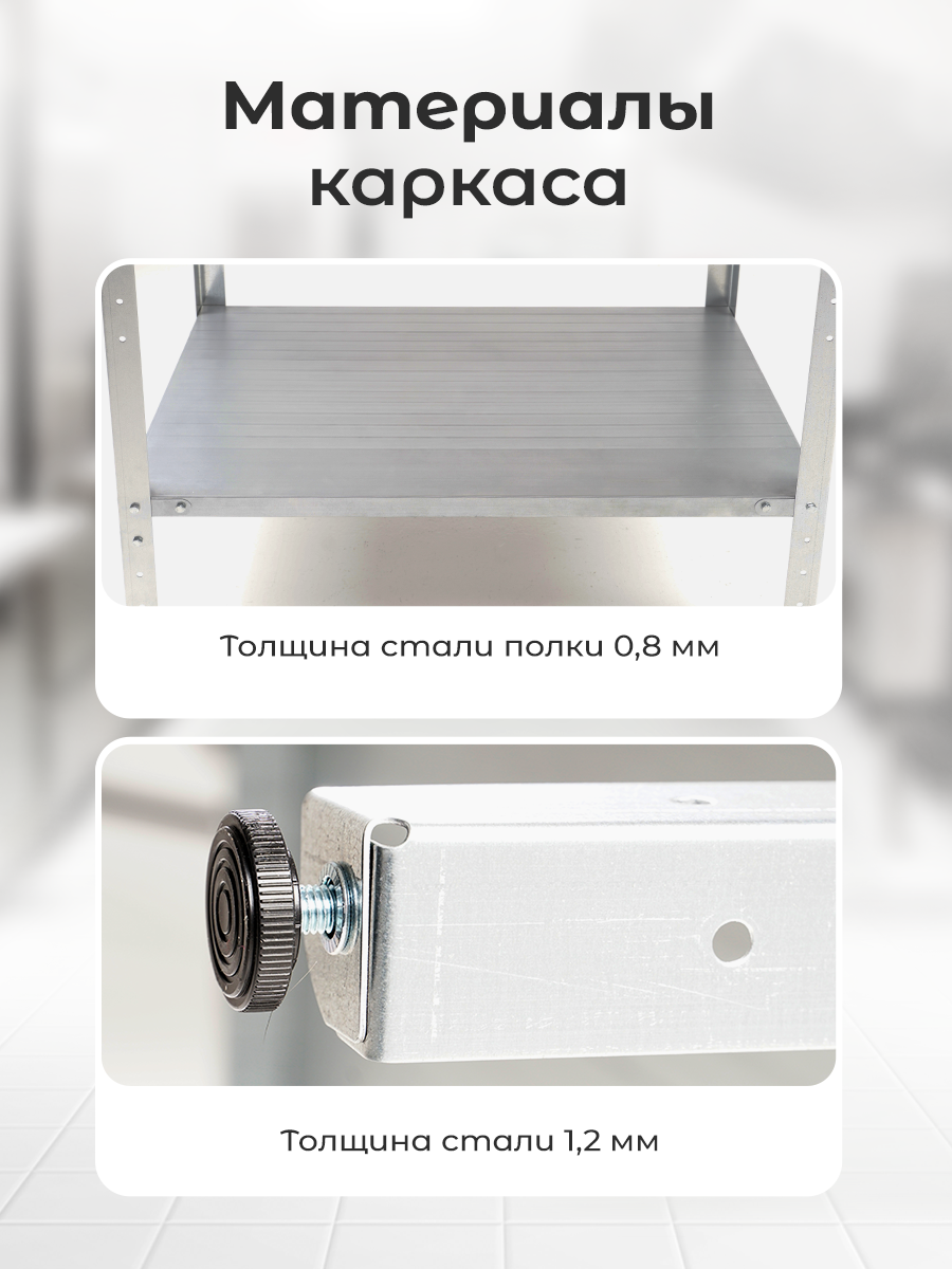 | Подробная комплектация | Столешница из нержавеющей стали 1 шт, сплошная полка из оцинкованной стали 1 шт, ножки с регулируемыми винтами 4 шт, комплект фурнитуры 1 шт |