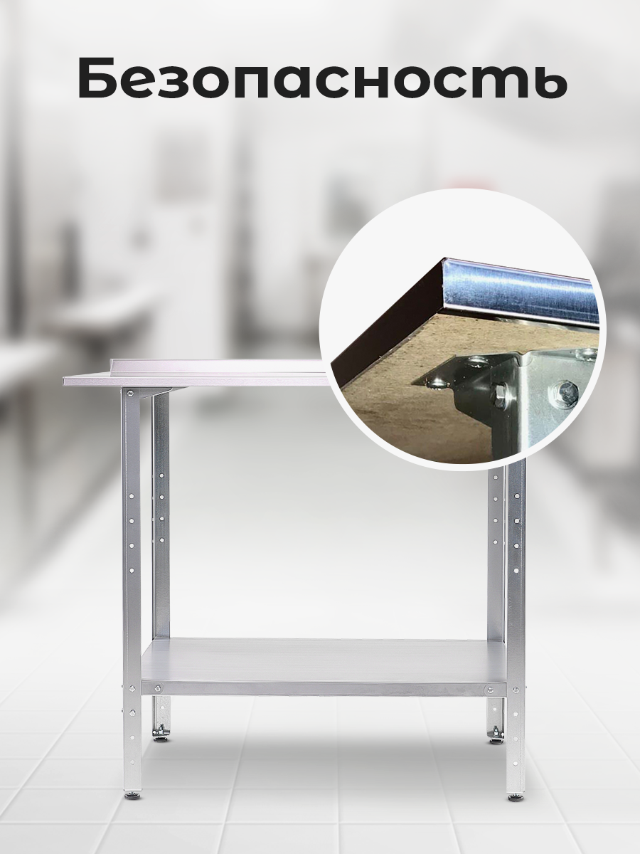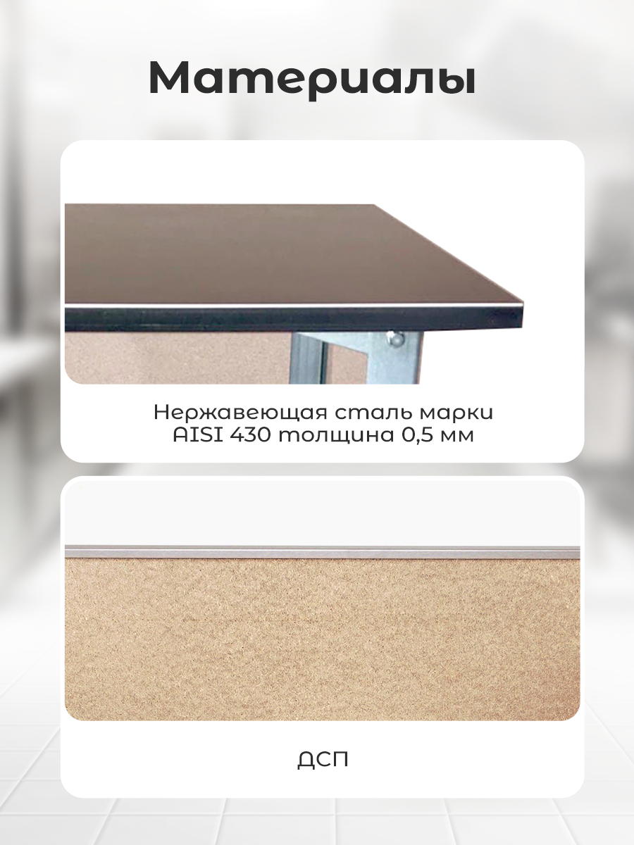 | Дополнительная информация | Столешницы столов производственных изготовлены из нержавеющей (коррозионностойкой) стали марки AISI 430 толщиной 0,5 мм, имеют двойной подгиб по лицевой стороне (безопасное исполнение), шлифованную поверхность с защитной полимерной пленкой, и усилены герметизированной по периметру 16 мм подложкой из ДСП. Элементы каркаса столов производственных (кронштейны и ножки) изготовлены из оцинкованной стали толщиной 1,2 мм. Ножки столов комплектуются регулируемыми полиамидными опорами, позволяющими компенсировать неровности пола при установке. Нижняя полка имеет сплошную поверхность и изготовлены из оцинкованной стали толщиной 0,8 мм. |