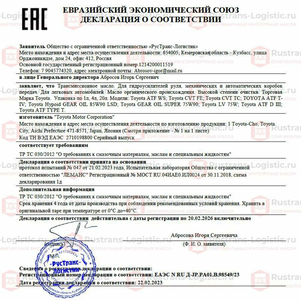 Купить Масло трансмиссионное Toyota CVTF FE (Таиланд), (4л) + перчатки, жидкость для бесступенчатой (вариаторной) коробки передач Тойота 08886-81905, РТЛ