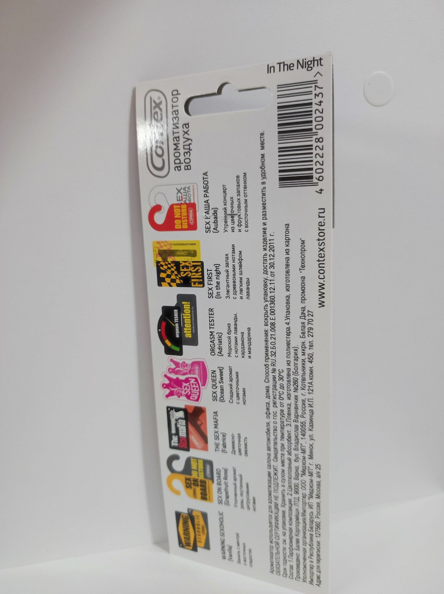 | Дополнительная информация | Ароматизатор для автомобиля CONTEX THE SEX MAFIA изысканный и соблазнительный, олицетворяющий пьянящую чувственность древесины, бархатистую горечь и окутанную цветочными нотками сладковатую дымку. Легкий, свежий аромат ненавязчиво погружает в радостный мир веселых фантазий, наполненный мечтами о неспешных прогулках по весеннему лесу, наполняет гармонией и умиротворением. |