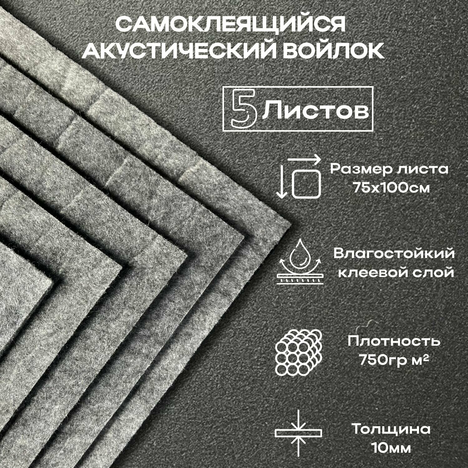Войлок Акустический Звуко-Теплоизоляционный - 10мм - 10 лист - 0,75-1м / Самоклеющийся Синтетический/ и Шумопоглощающий материал для автомобиля