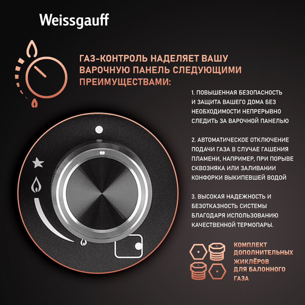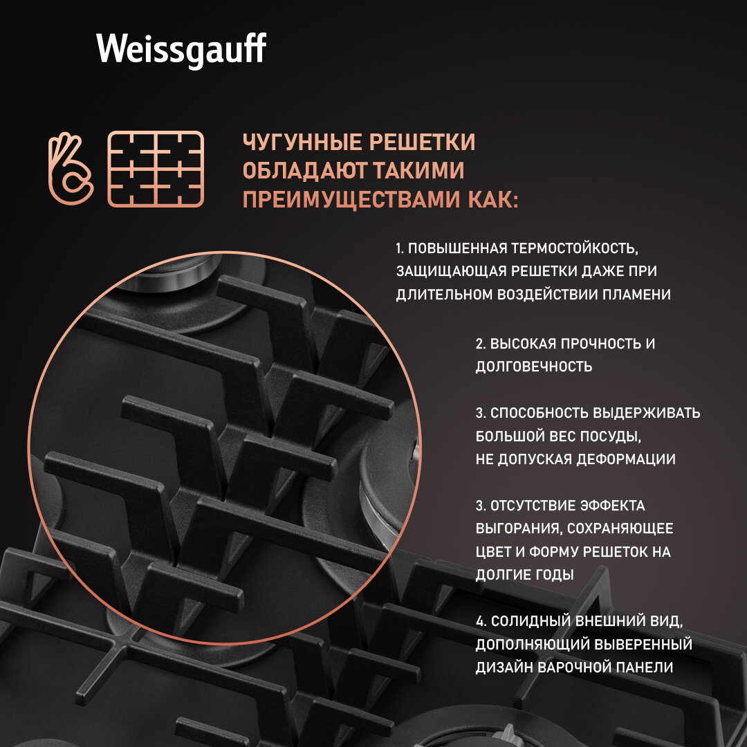 Варочная панель Weissgauff HGG 451 BFh Nano Matt Glass wok-конфорка, 3 года гарантии, 45 см ширина, Чёрное закаленное стекло с покрытием NanoGlass, Автоматический электроподжиг, газ-контроль, решетки из чугуна, Рукоятки Hi-Tech интересное: