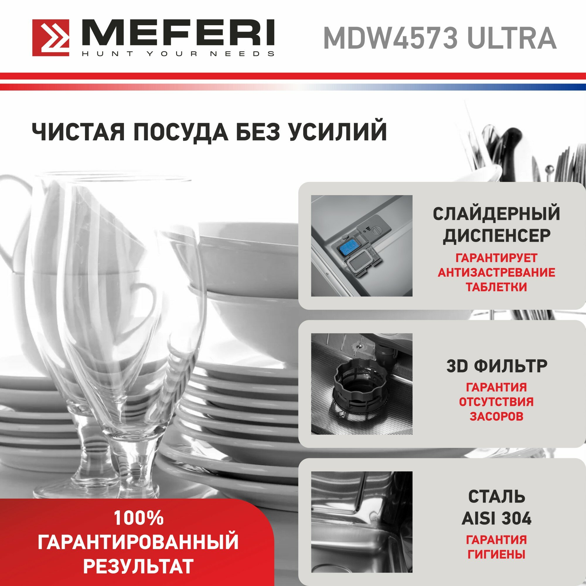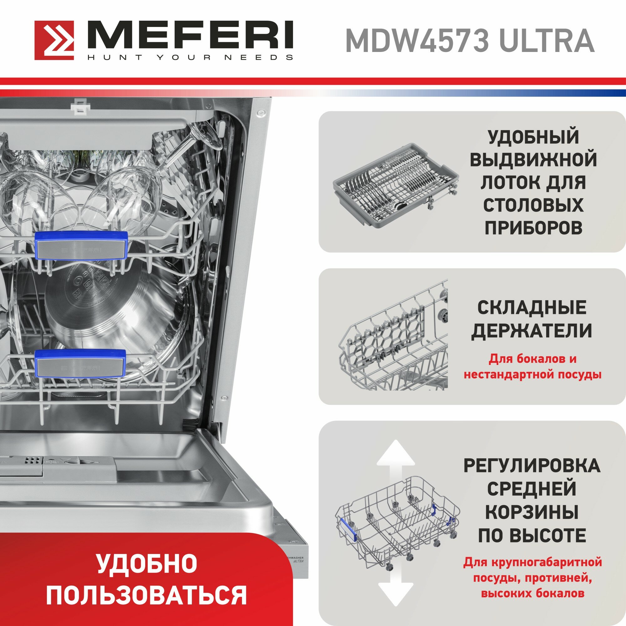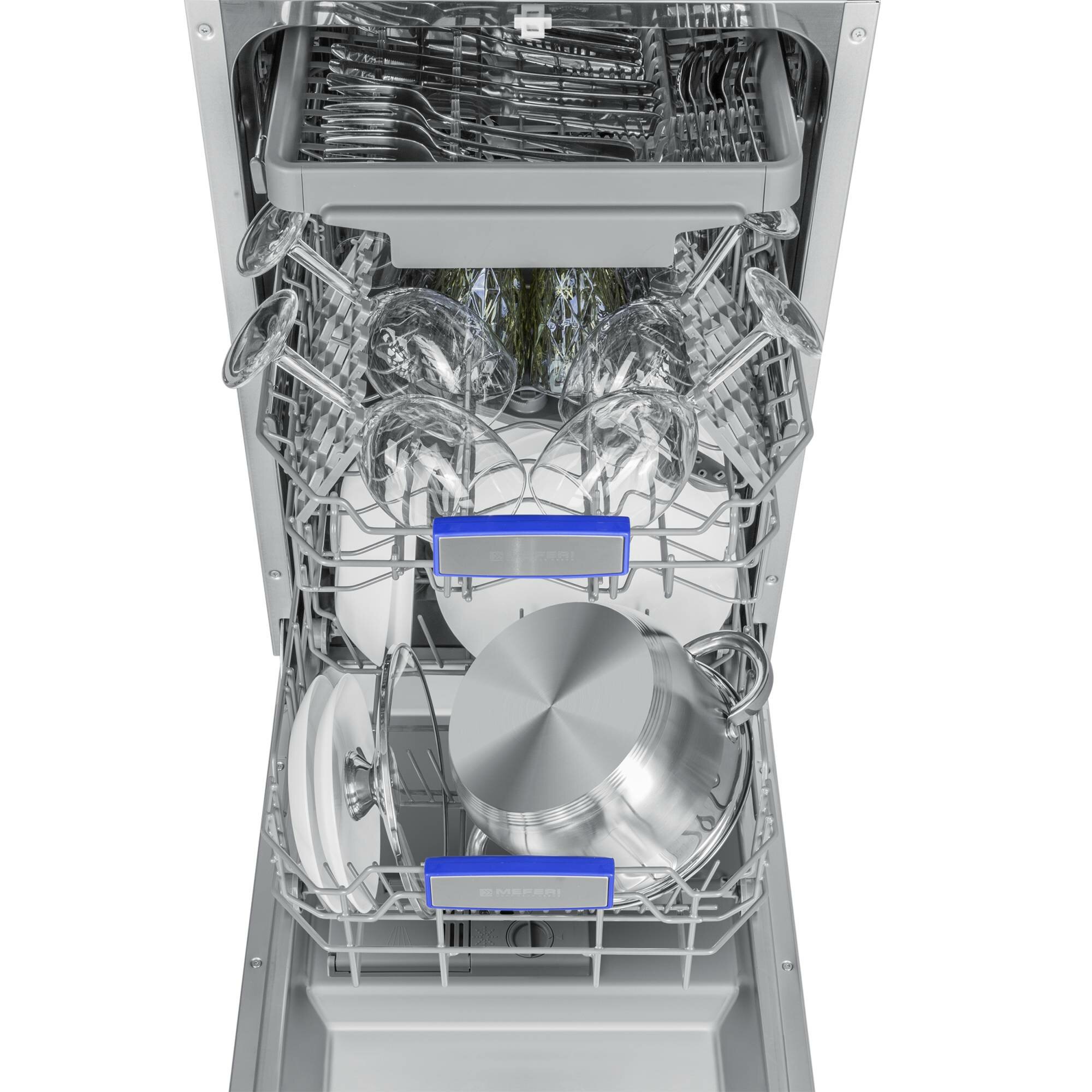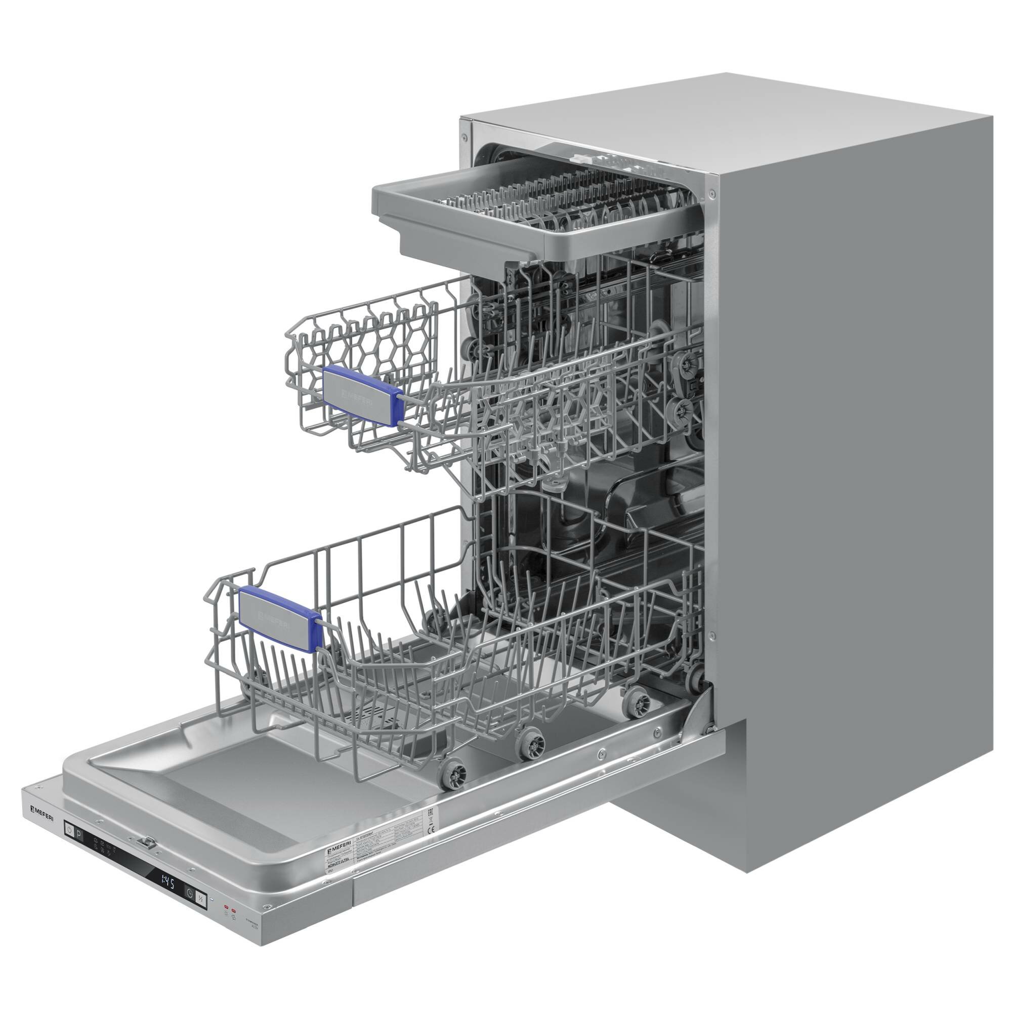 Посудомоечная машина встраиваемая 45 см MEFERI MDW4573 ULTRA, луч на полу, подсветка, 3 корзины, 7 программ, 10 комплектов, защита от протечек интересное: