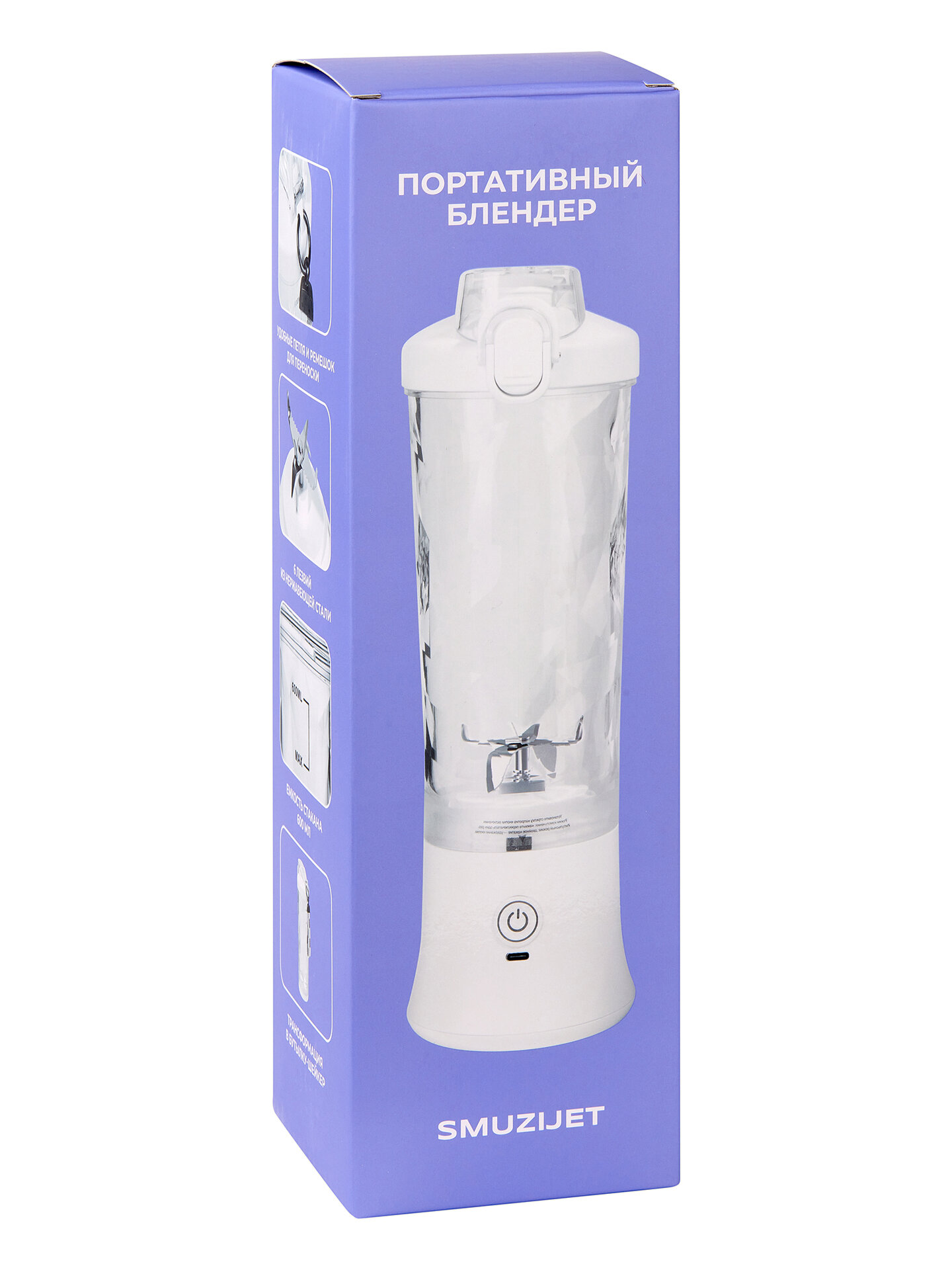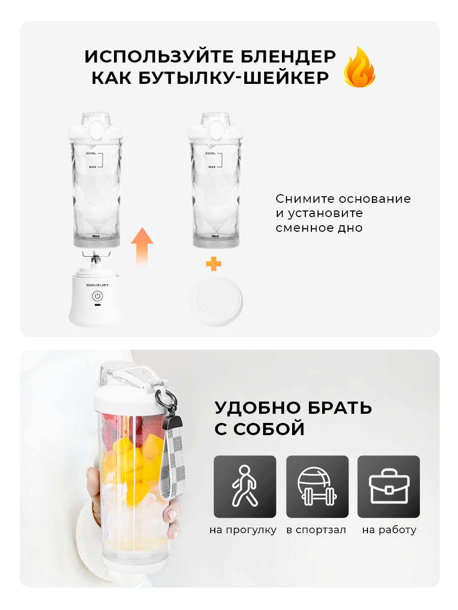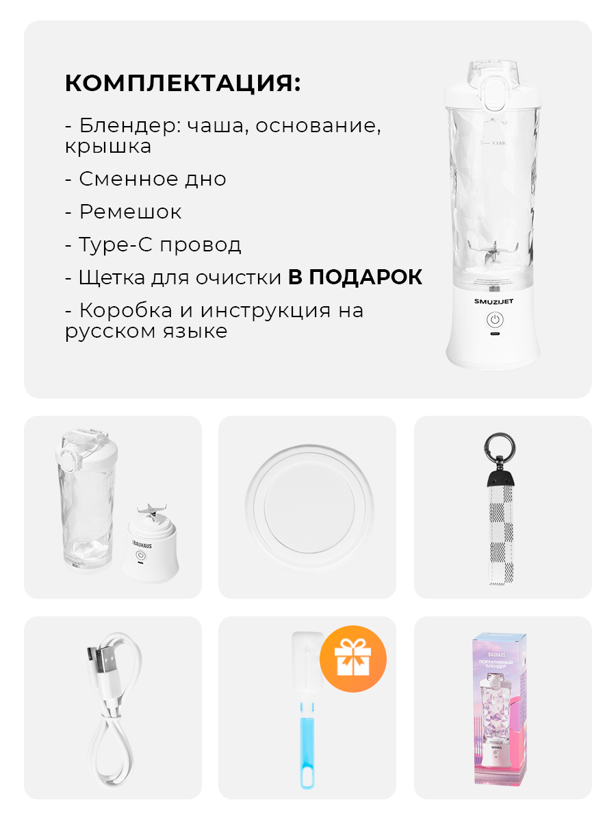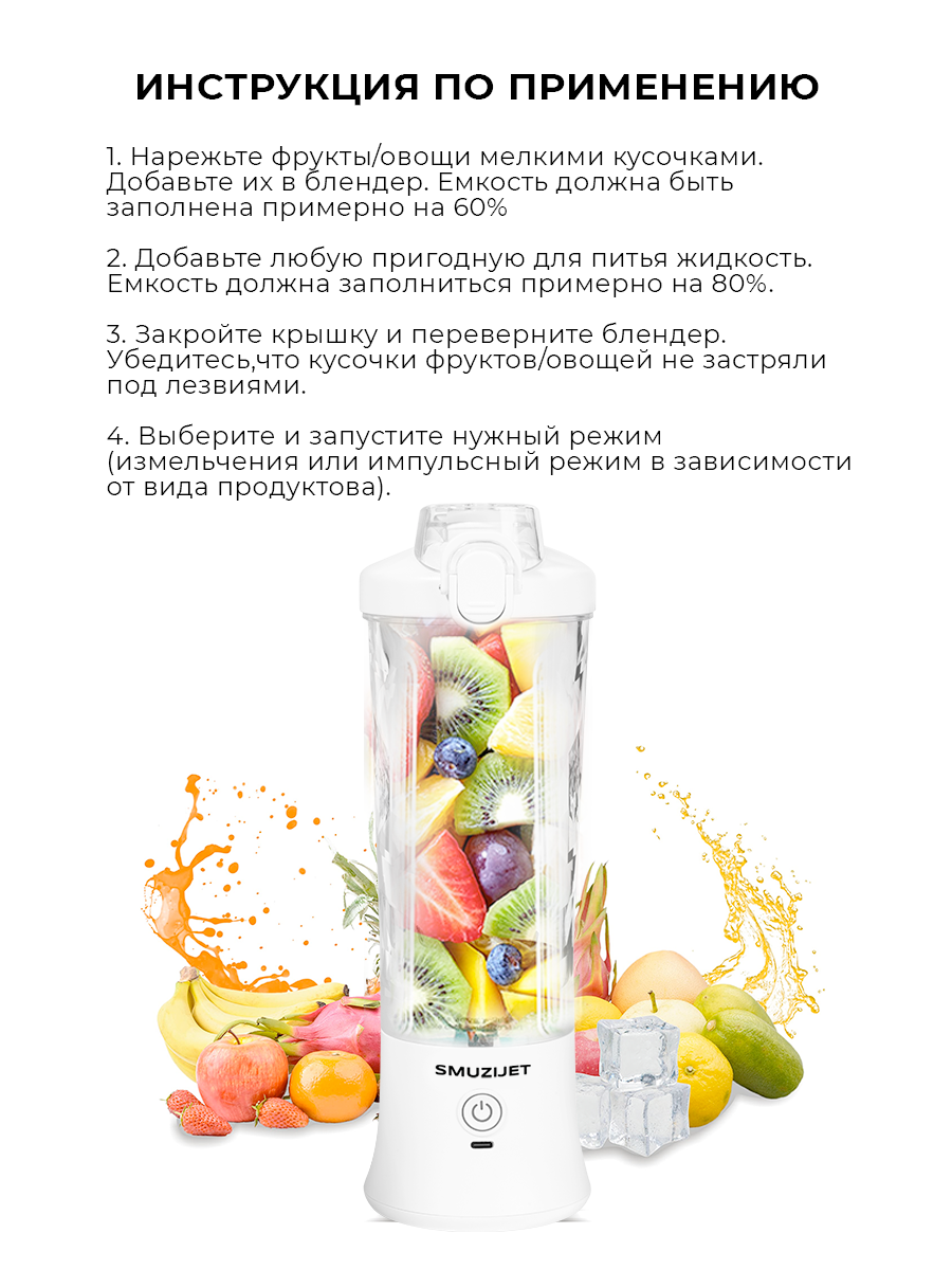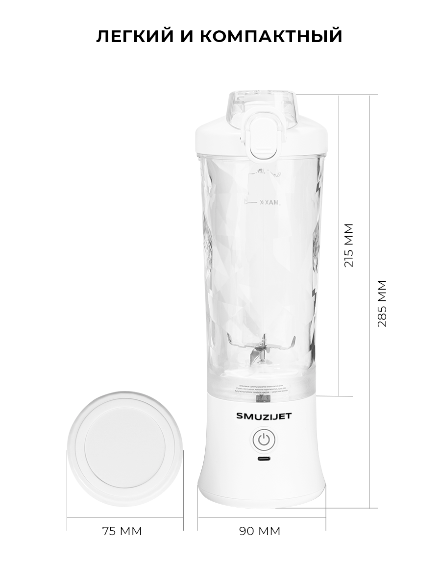 Портативный мини блендер SMUZIJET для смузи и коктейлей белый интересное: