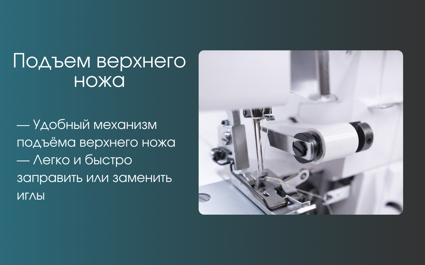 | Дополнительные функции | дифференциальная подача, отключение ножа, регулировка прижима ткани, регулировка ширины обреза ткани |