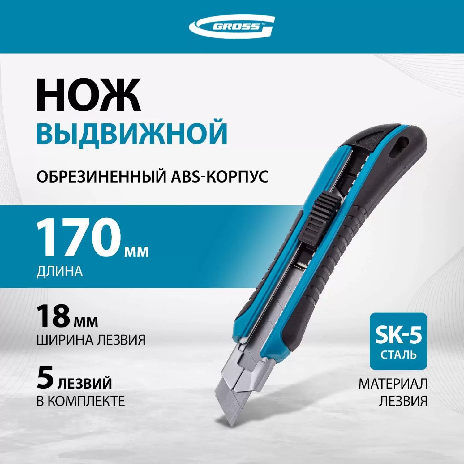 GROSS Нож 170 мм, обрезиненный ABS-корпус, выдвижное сегментное лезвие 18 мм (SK-5), металлическая направляющая, 5 лезвий Gross, ( 78893 ) интересное:
