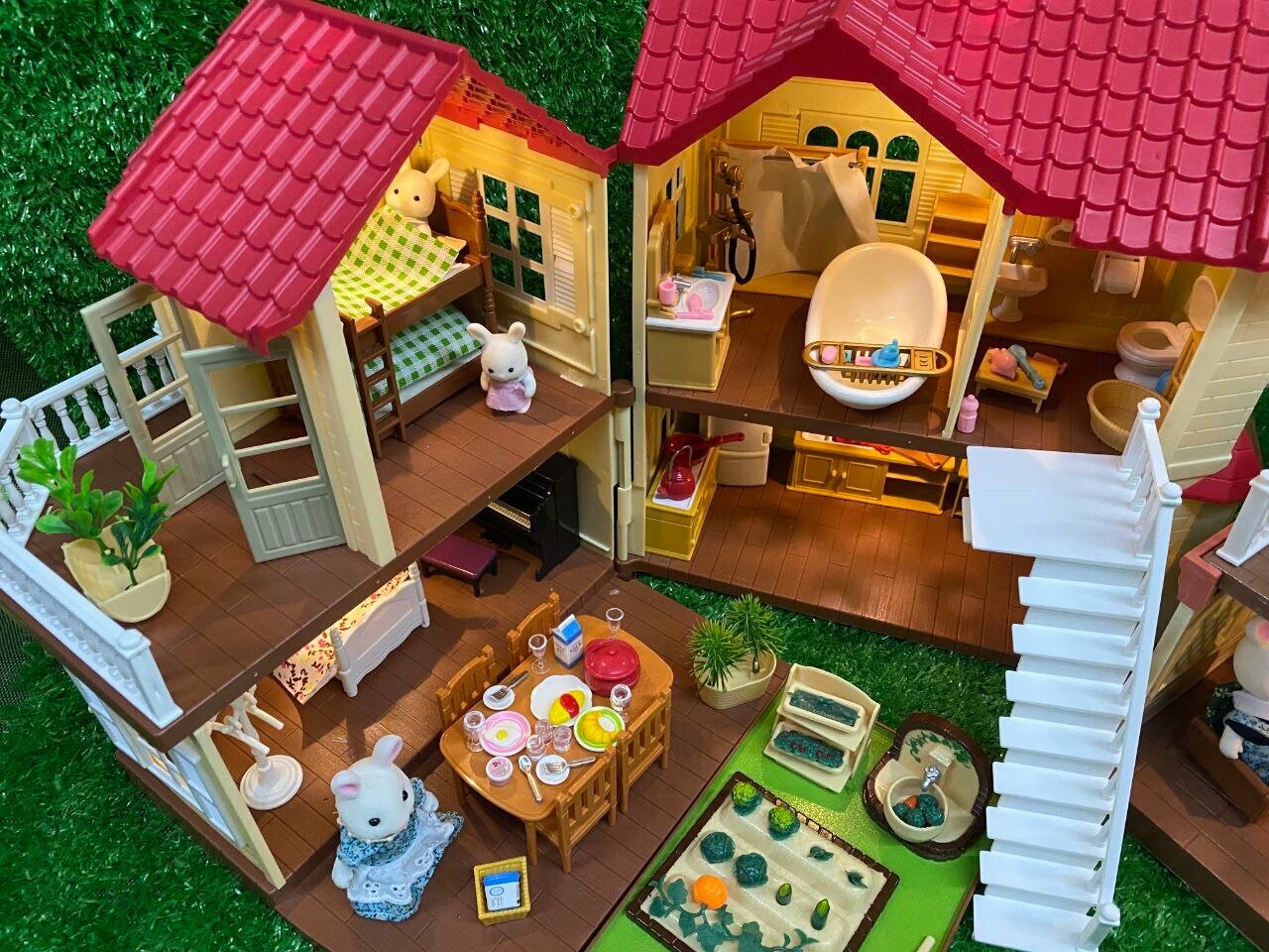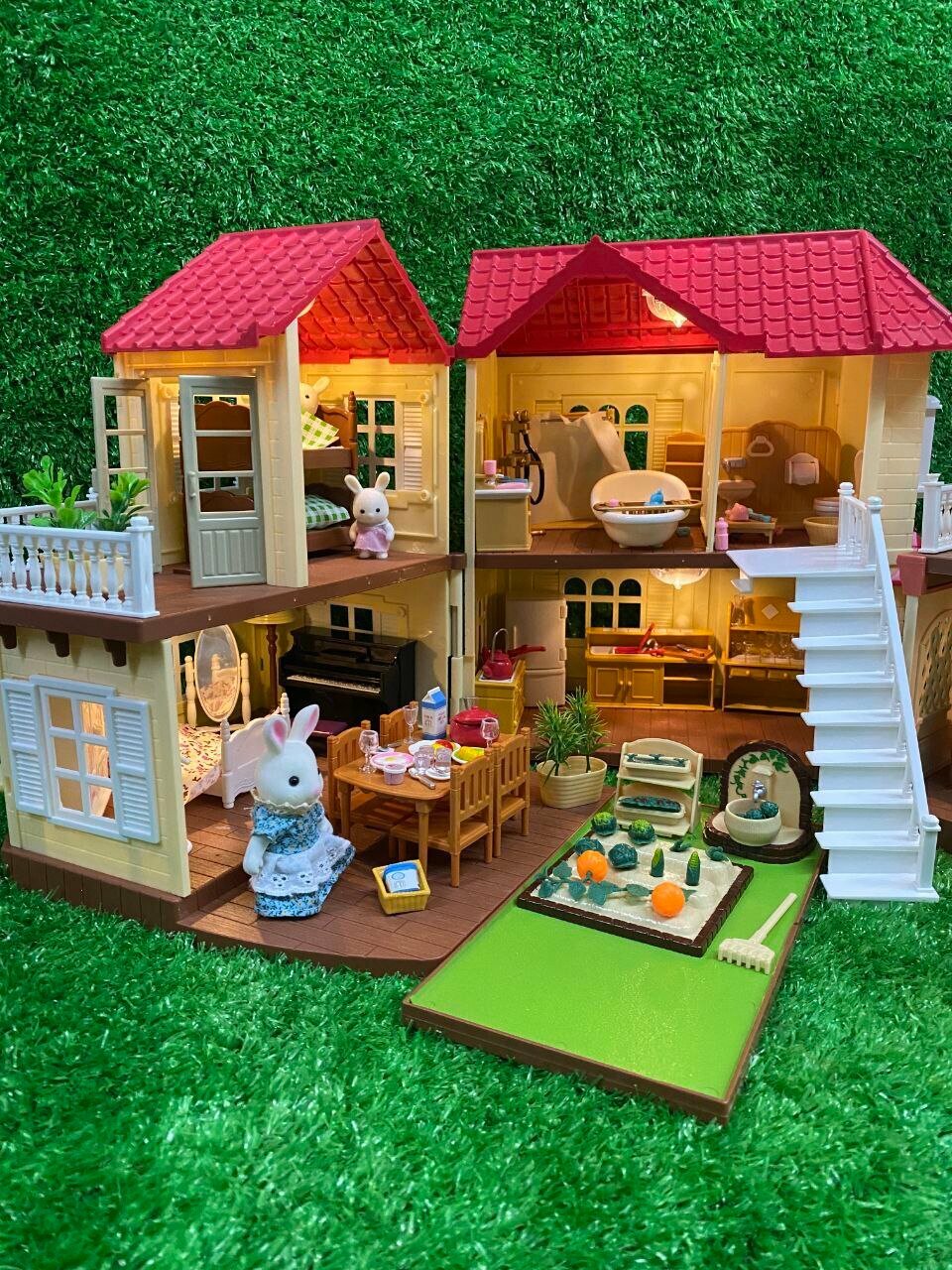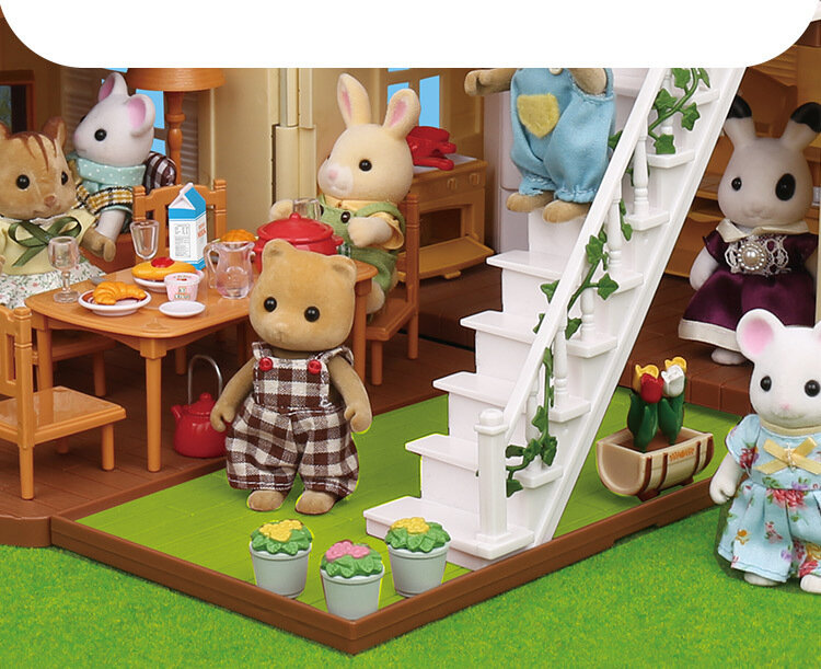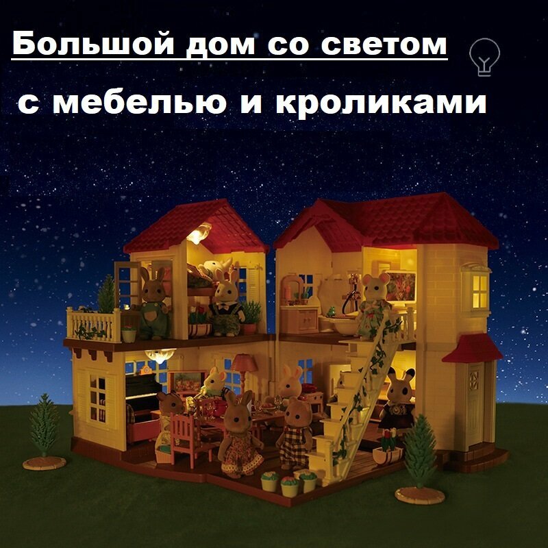 | Подробная комплектация | В комплект входит каркас дома в два этажа с лестницей, балконом и огородом, 9 комплектов мебели, семья кроликов, мама, папа, двое детей, 4 лампы для света (с батарейками) |