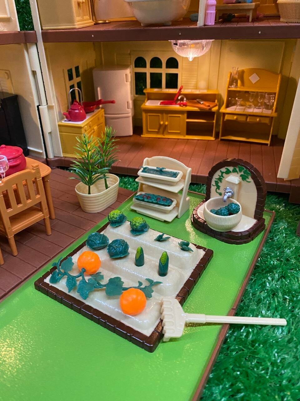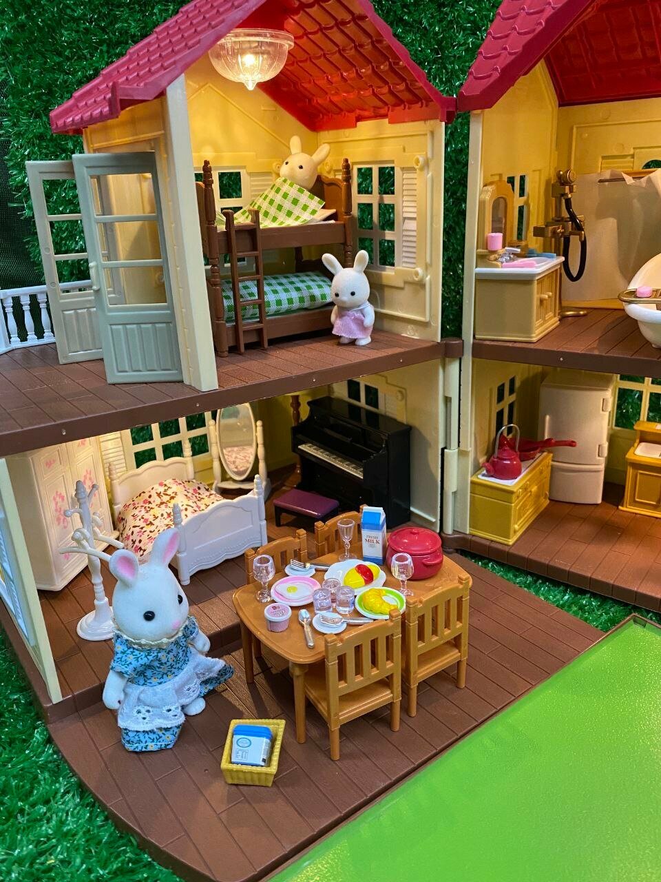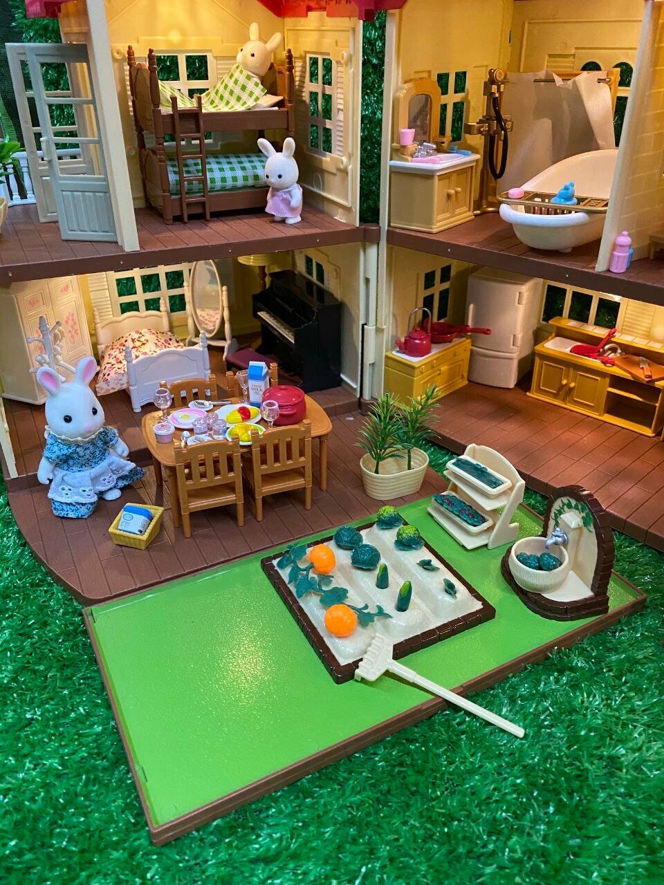| Подробная комплектация | В комплект входит каркас дома в два этажа с лестницей, балконом и огородом, 9 комплектов мебели, семья кроликов, мама, папа, двое детей, 4 лампы для света (с батарейками) |