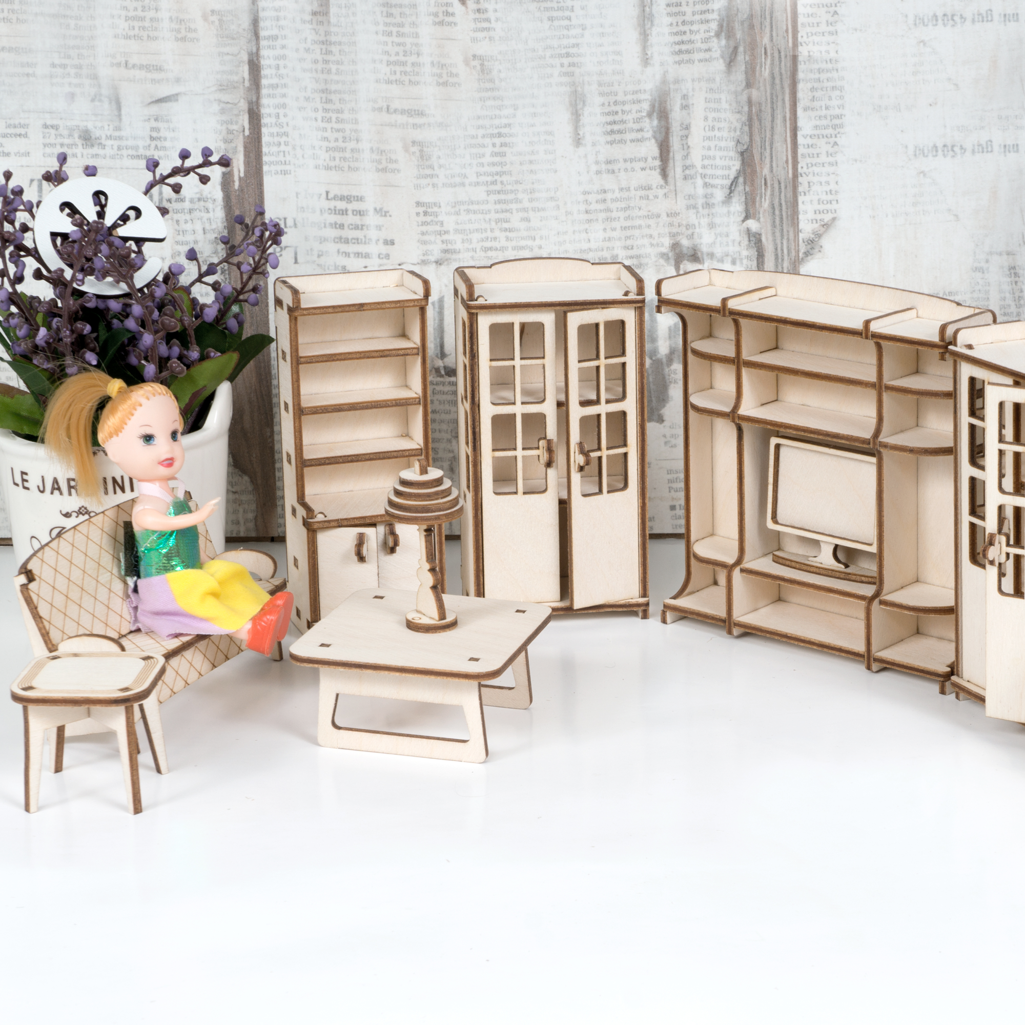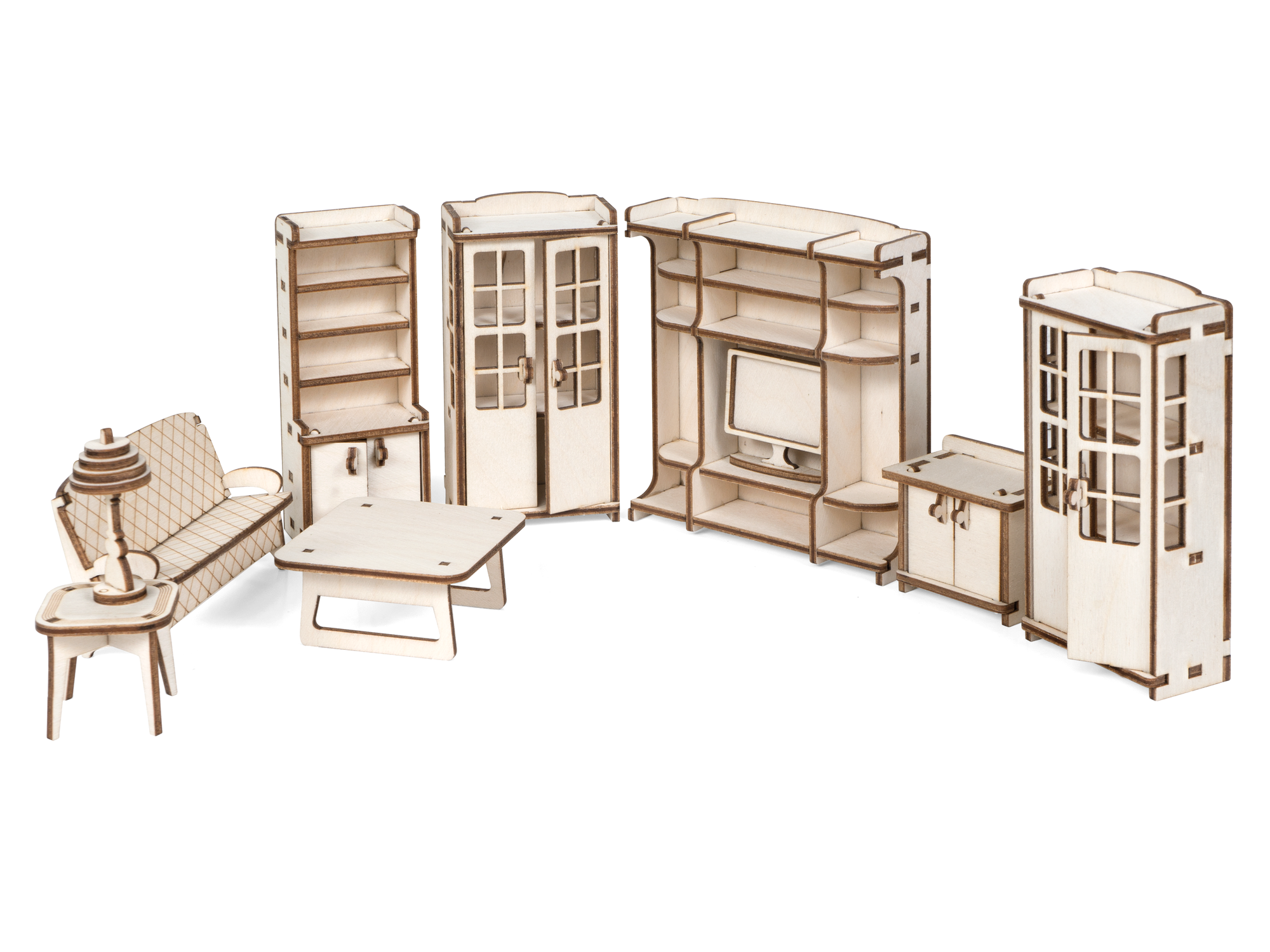 | Комплектация | сервант 117*60*35 мм, книжный шкаф 115*45*35 мм, диван 55*100*40 мм, тумбочка 47*55*35 мм, стенка под телевизор 118*112*35 мм, столик 35*40*40 мм, лампа 30*25*25 мм, журнальный столик 30*65*65 мм, телевизор 40*45*10 мм, наждачная бумага, клей ПВА, инструкция |