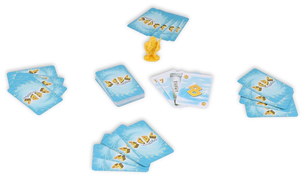 | Комплектация | 40 карт с числами от 1 до 10 по 4 каждого вида, Посейдон 4 карты, Арес 3 карты, Афина 3 карты, Гермес 3 карты, Афродита 2 карты, Аполлон 2 карты, Артемида 2 карты, Гера 1 карта и фигурка Зевса-громовержца, правила игры на русском языке |