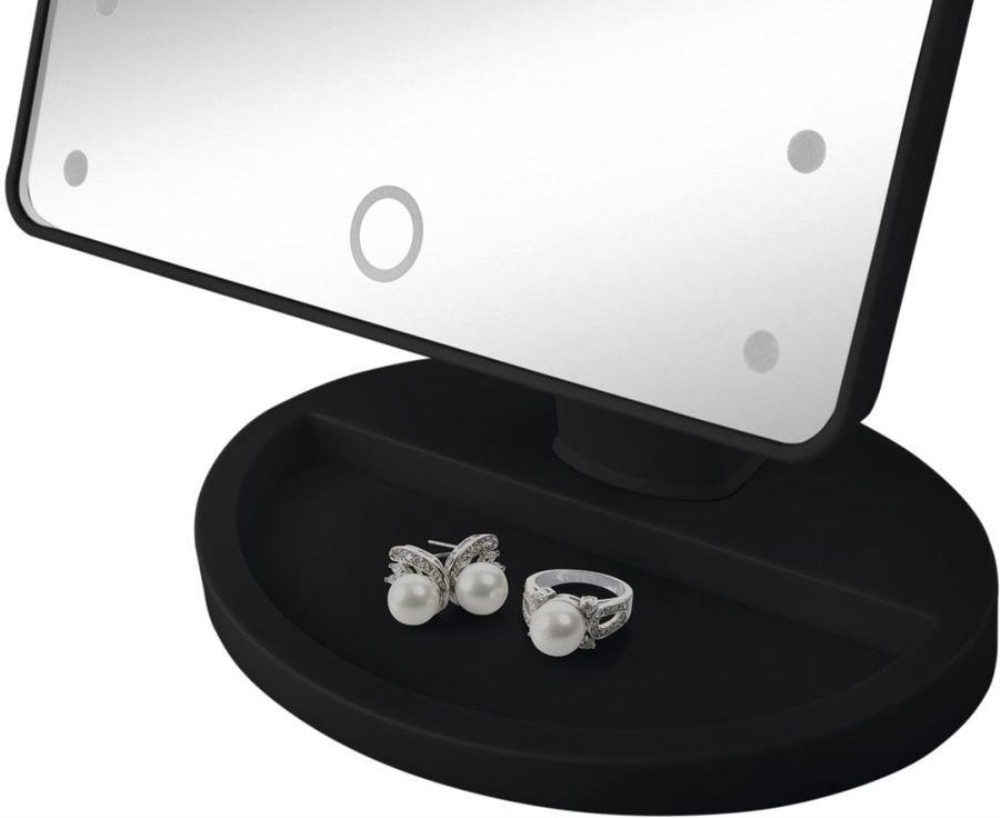 Но открыть отсек для батареек оказалось непростой задачей, так как не хотелось сломать хрупкий пластик в первое же использование. Пришлось аккуратно поддевать канцелярским ножом. Батарейки не идут в комплекте, так что заранее купите 4 батарейки типа АА. У меня самые дешевые и «сердитые». Приятно наличие подставки для хранения аксессуаров. Туда можно положить украшения. Теперь о подсветке. По бокам зеркала расположены 16 светодиодов. Внизу по центру сенсорная кнопка, которая регулирует уровень света. Для включения\выключения нужно коснуться этой кнопки. Для регулировки яркости коснитесь кнопки и подержите ее, выбирая интенсивность света. Так же можно менять угол наклона зеркала. По итогу могу сказать, что зеркалом очень довольна, заказывала на официальном сайте, привезли через день после оформления заказа. Полностью оправдывает свою цену, не занимает много места и выглядит достойно. Рекомендую к покупке. |