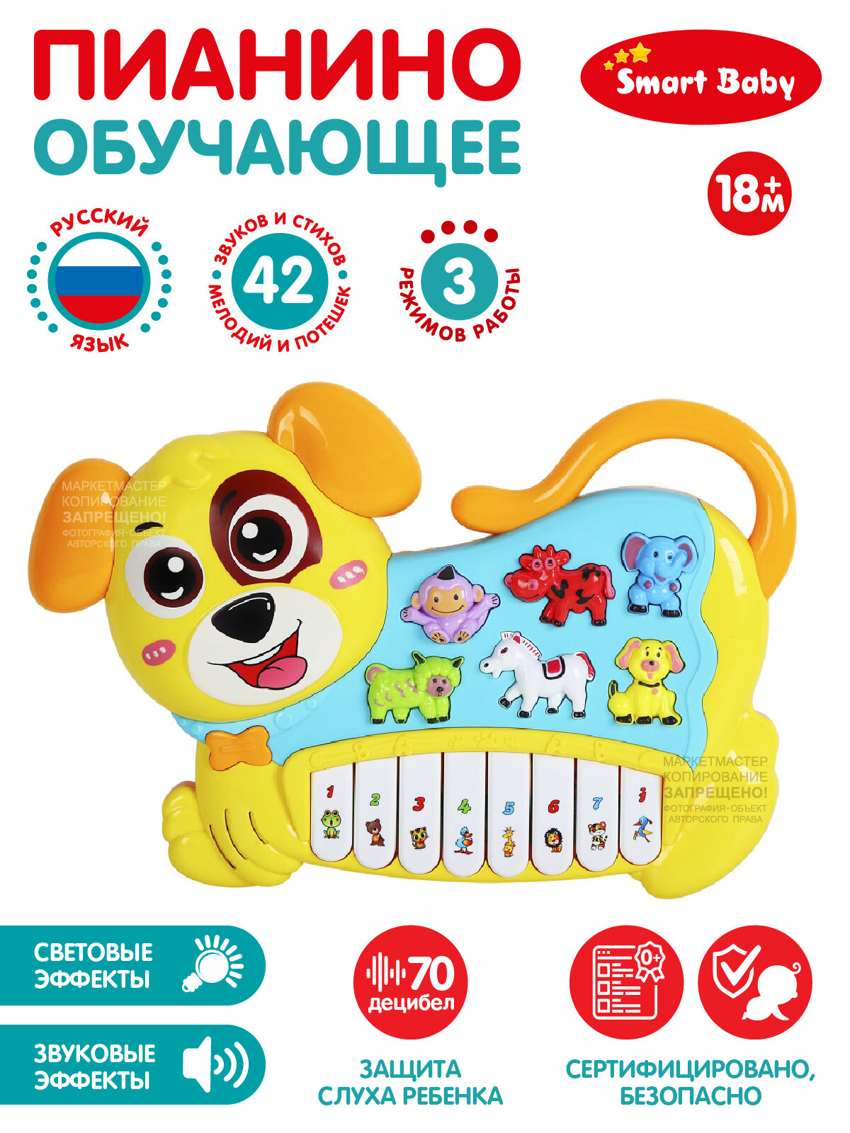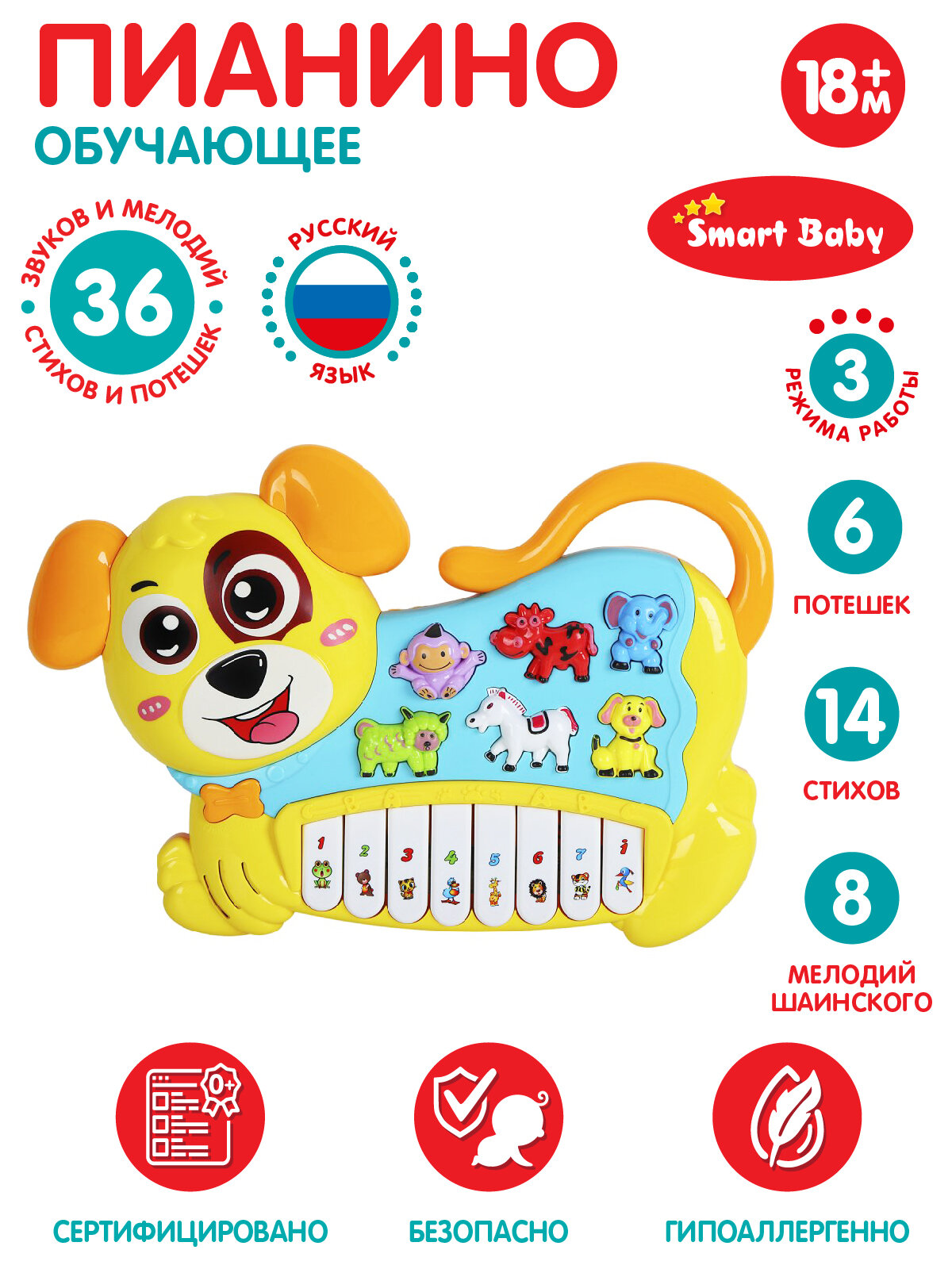 Развивающая игрушка Джамбо Тойз, Пианино обучающее "Собака", 42 звука, мелодии, стихи, желтый интересное: