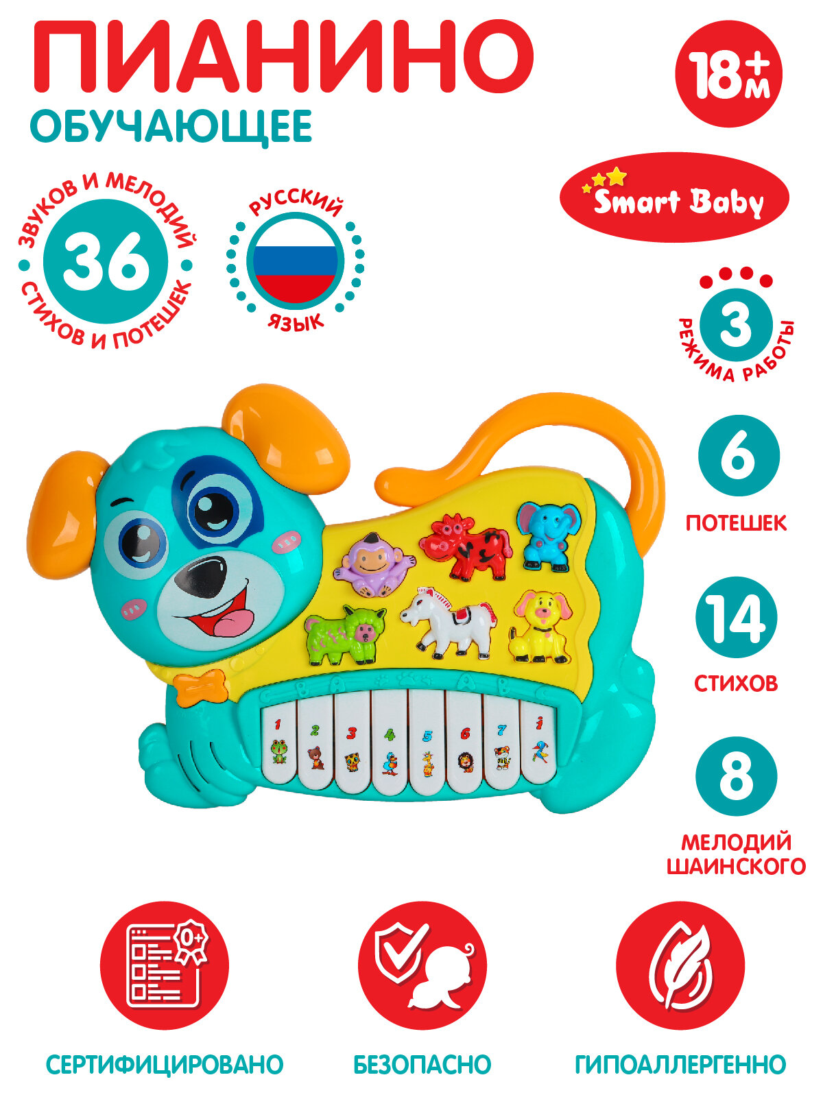 Развивающая игрушка Джамбо Тойз, Пианино обучающее "Собака", 42 звука, мелодии, стихи, голубой интересное: