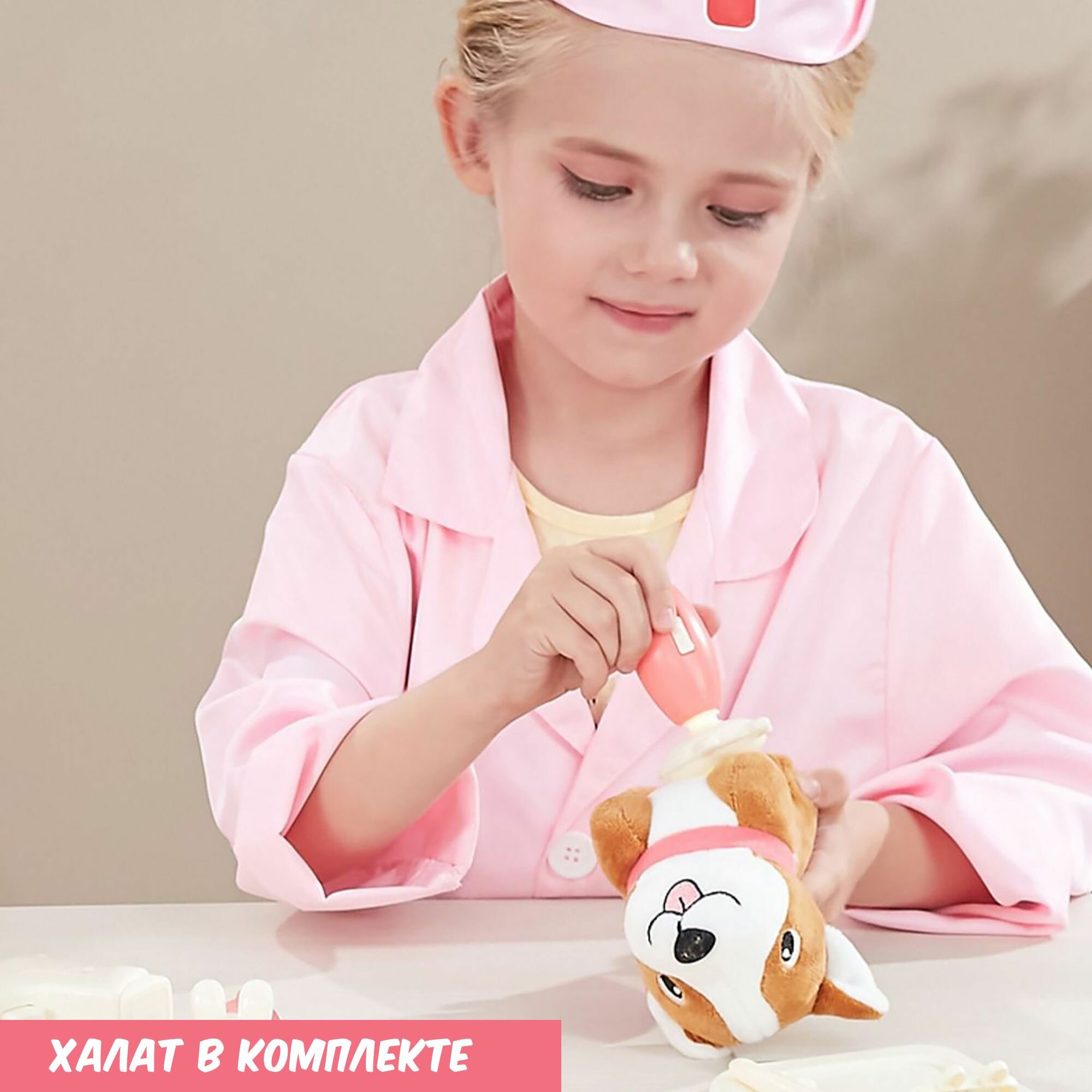 Купить Набор доктора детский "Кролик", с халатом, розовый, 45 предметов, на батарейках
