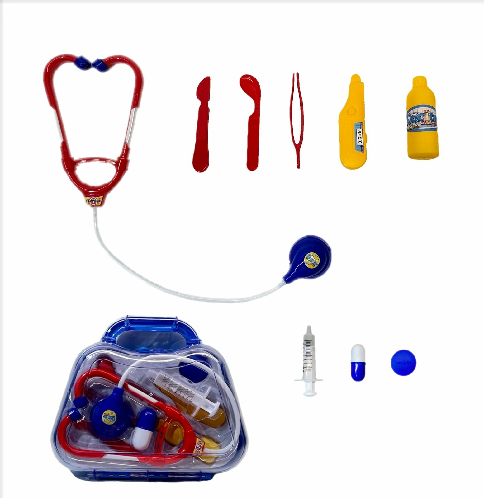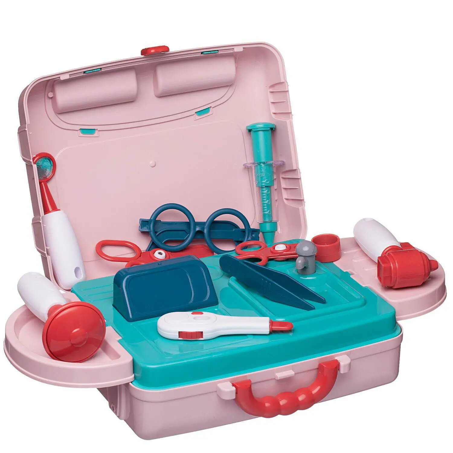 | Комплектация | чемоданчик - 1 шт, навесные полки - 2 шт, столешница с раковиной - 1 шт, водопроводный кран - 1 шт, полка с крючками -1 шт, стойки 4 шт, декоративные детали для полноценной сборки конструкции - 2 шт, ножницы - 1 шт, щипцы - 1 шт, пинцет - 1 шт, шприц - 1 шт, градусник - 1 шт, отоскоп - 1 шт, зеркало отоларинголога - 1 шт, рефлекторный молоточек - 1 шт, очки - 1 шт, кардиограф - 1 шт |