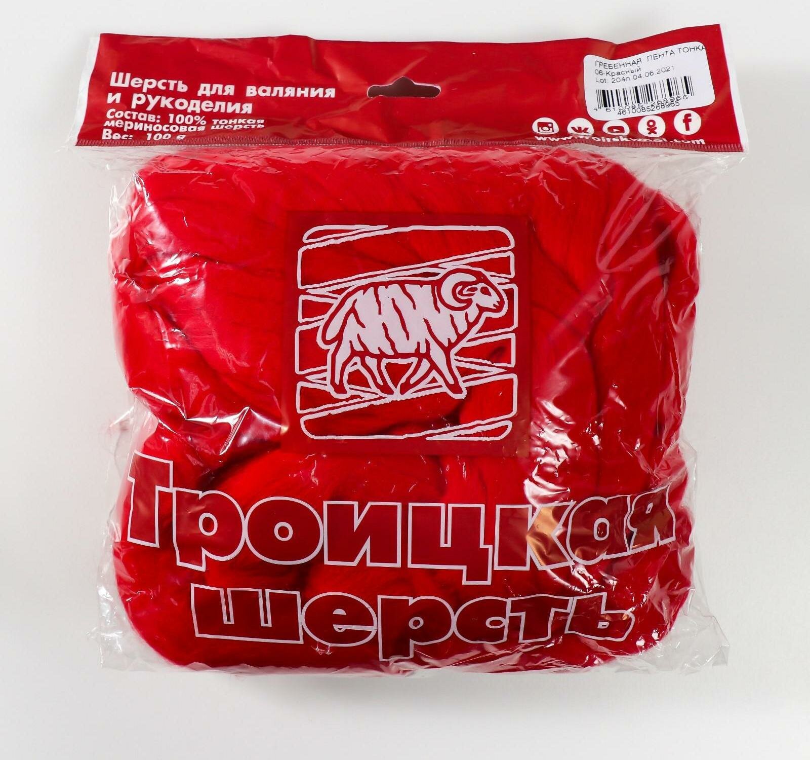 Шерсть для валяния ТРО Гребенная лента (тонкая мериносовая шерсть) 100г цв.0006 красный