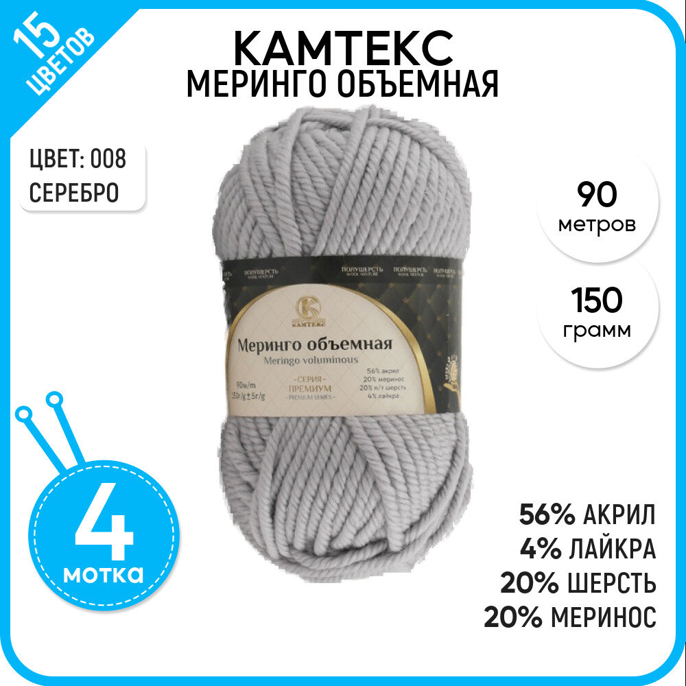 Купить Пряжа для вязания Камтекс 'Меринго объемная', 150г, 90м (20% меринос, 20% полутонкая шерсть, 56% акрил, 4% лайкра) (008 серебристый), 4 мотка