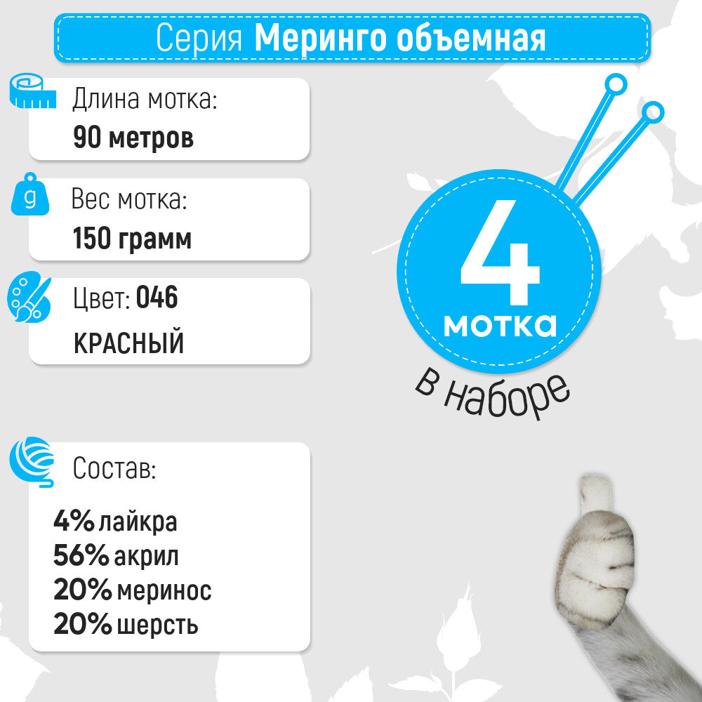 СохранитьПряжа для вязания Камтекс 'Меринго объемная' 150 г, 90 м (20% меринос, 20% полутонкая шерсть, 56% акрил, 4% лайкра) (046 красный), 4 мотка интересное: