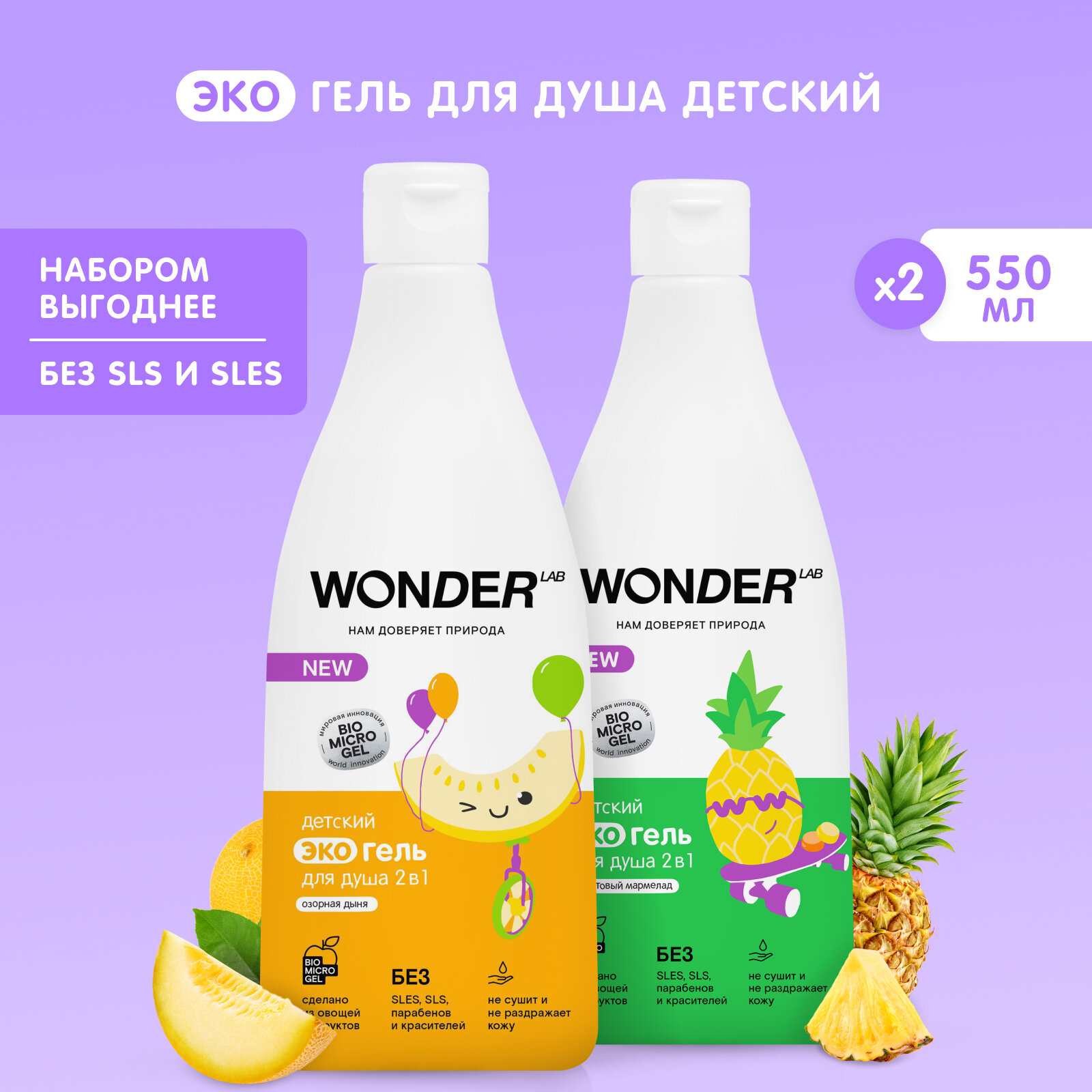 Набор эко гель 2в1 для душа WONDER LAB, гель-шампунь для купания детей с ароматом "Озорная дыня" и "Фруктовый мармелад", 3+, 2х550 мл