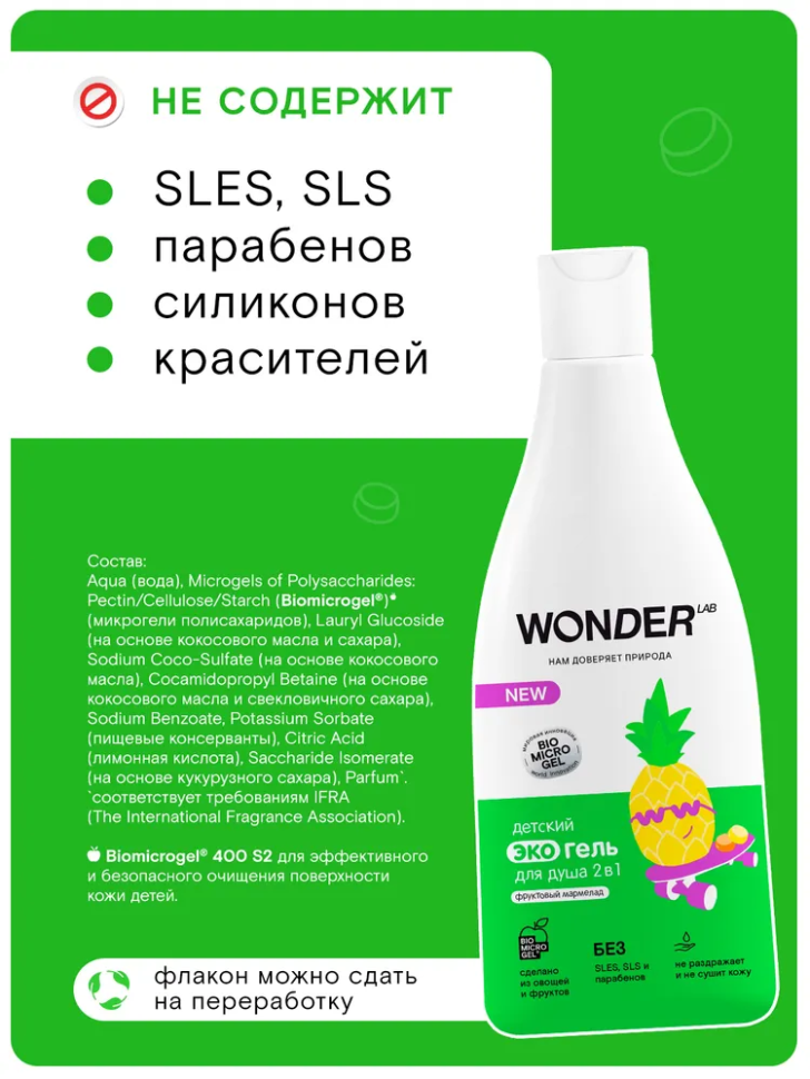 Детский эко гель 2в1 для купания детей WONDER LAB, с ароматом "Фруктовый мармелад", гель - шампунь для душа, 3+, 550 мл