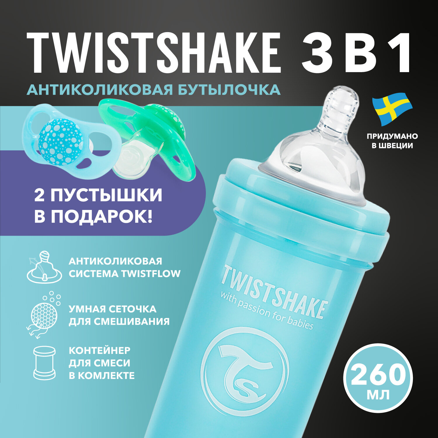Купить Детская антиколиковая бутылочка Twistshake для кормления, пастельная синяя, 260 мл, от 2+ мес., подарок 2 пустышки