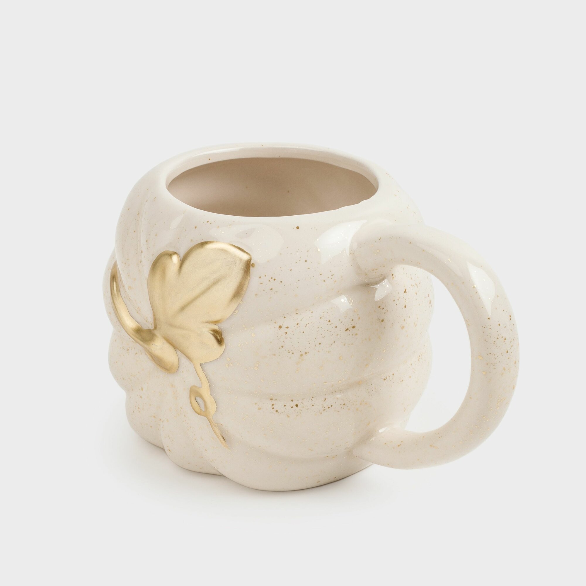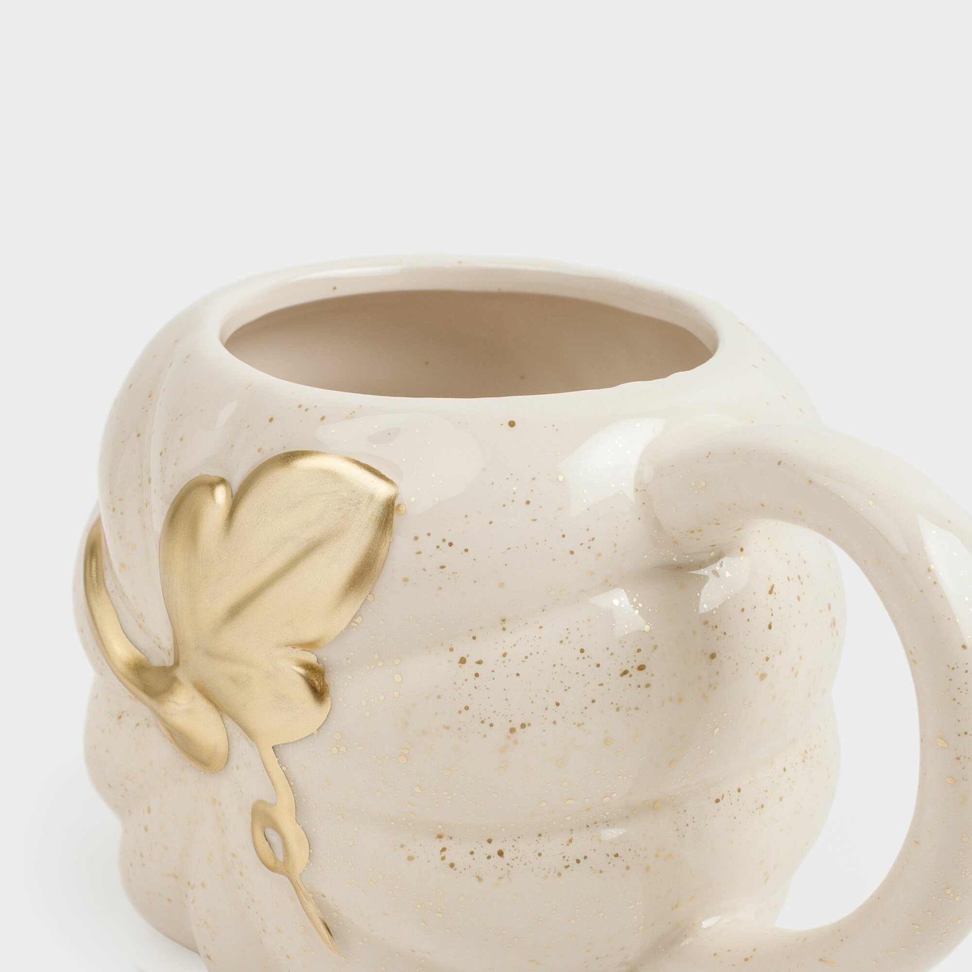 Купить Кружка, 540 мл, керамика, молочно-золотистая, в крапинку, Тыква с листом, Golden glow