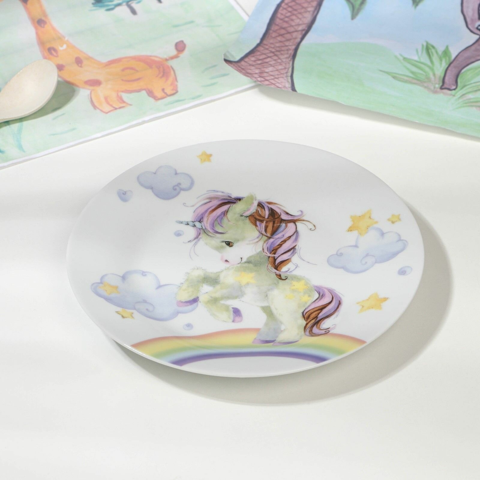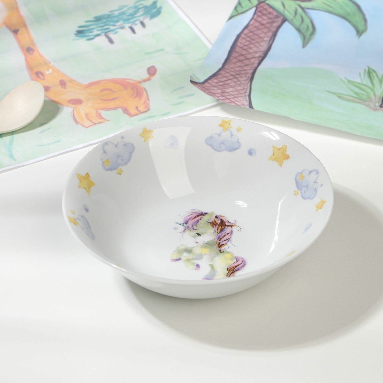 Доляна Набор детской посуды из керамики Доляна «Единорог», 3 предмета: кружка 230 мл, миска 400 мл, тарелка d=18 см, цвет белый