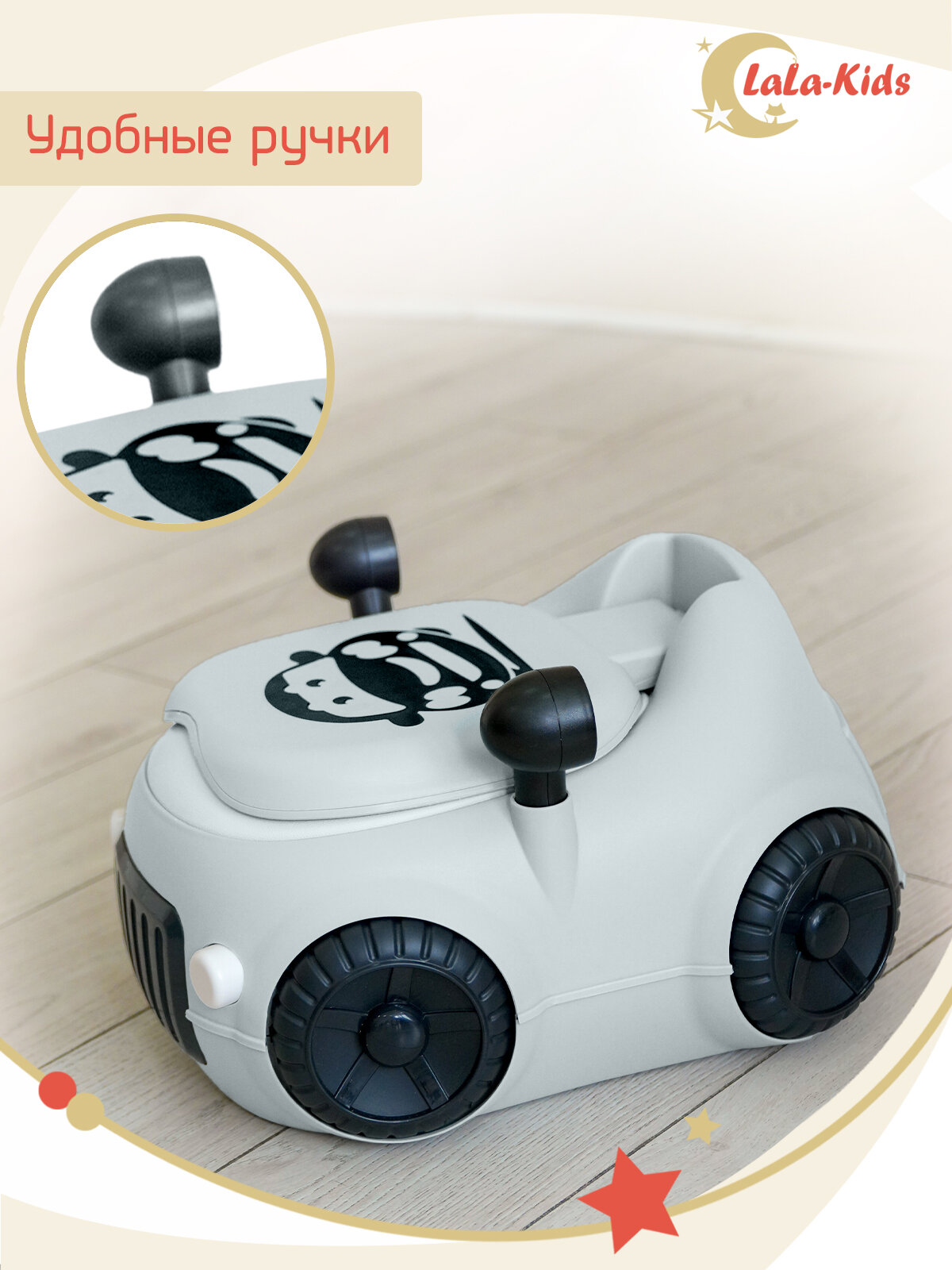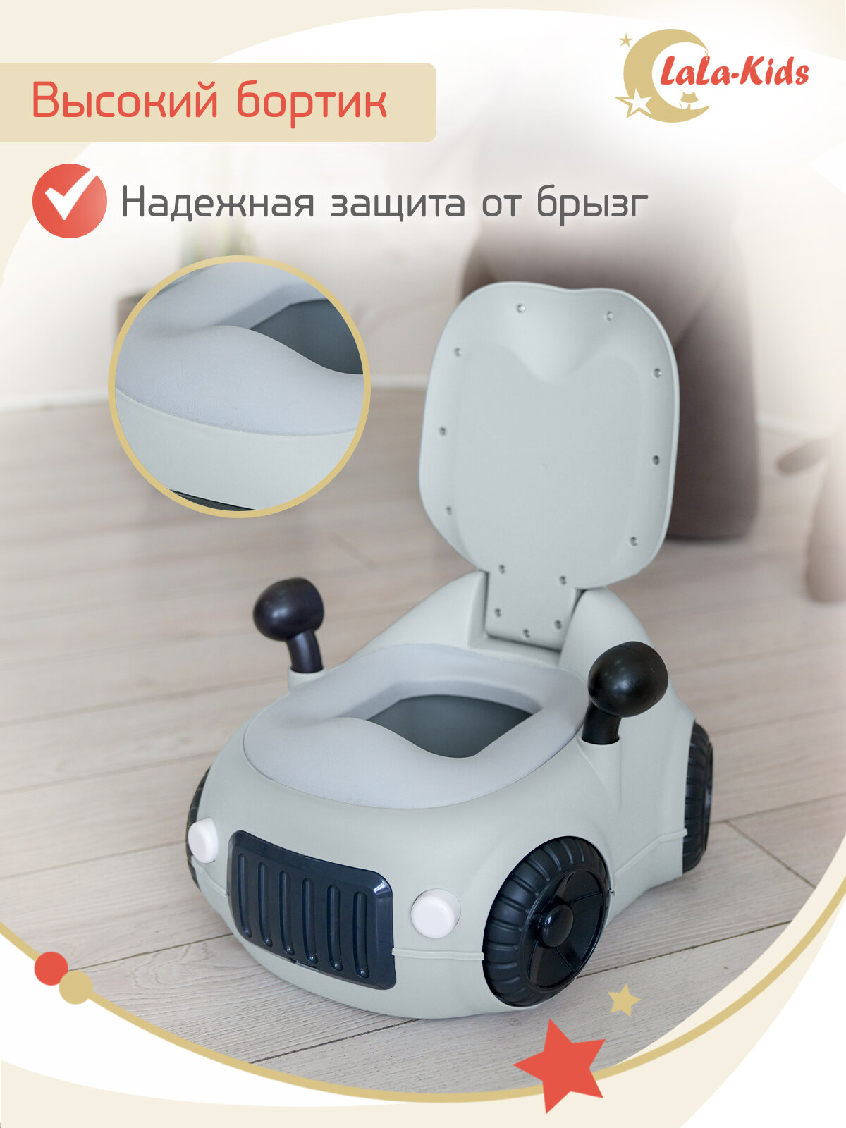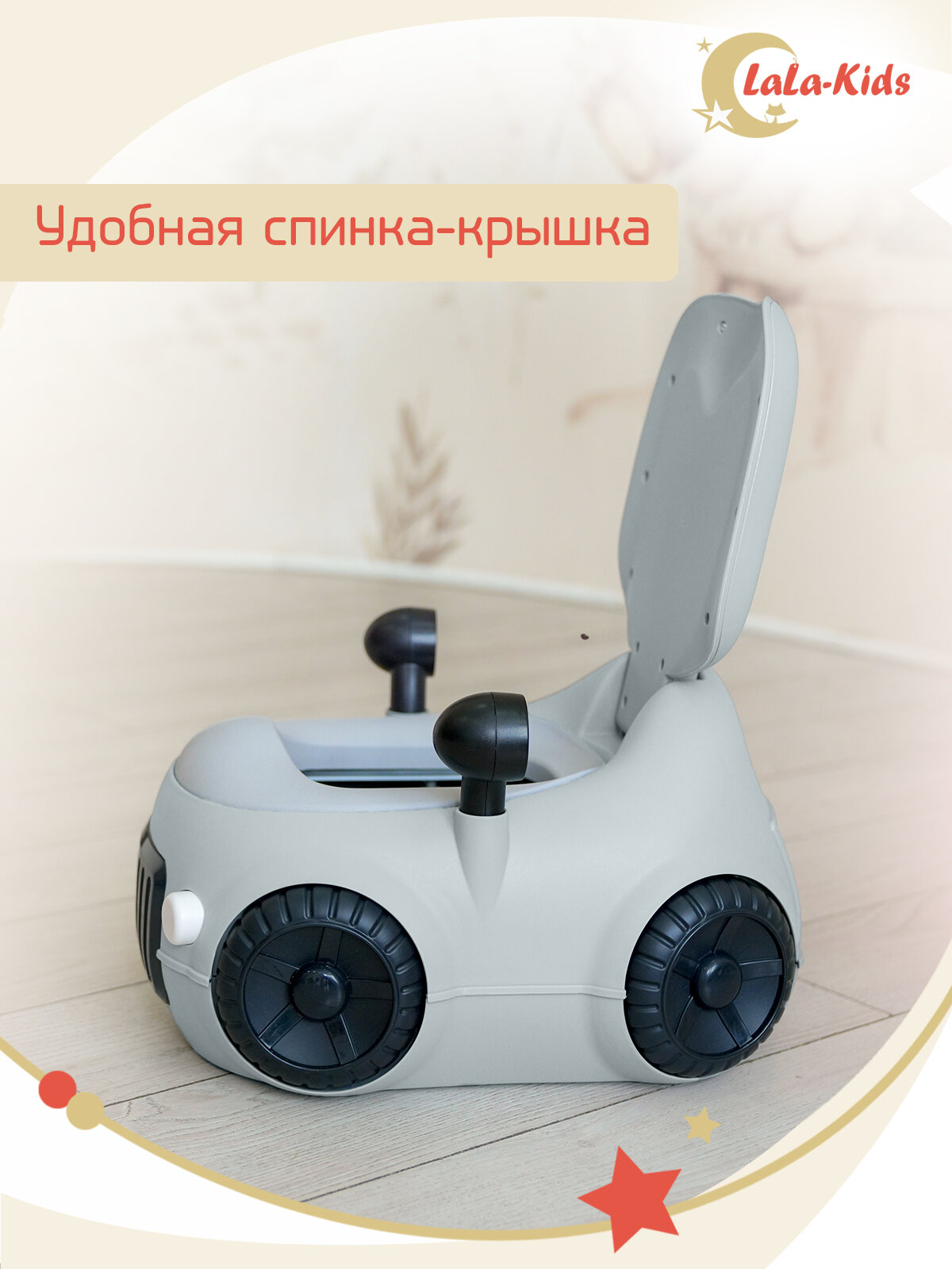 Детский горшок LaLa-Kids с мягким сиденьем и крышкой "Машинка" серая интересное: