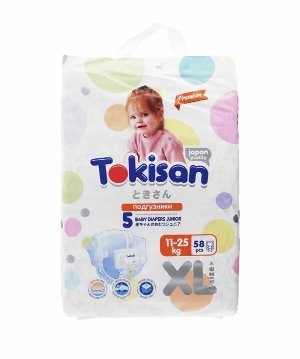 Купить Подгузники детские Tokisan Premium JUNIOR XL для малышей 11-25 кг, 5 размер, 58 шт, дневные (ночные) с индикатором наполнения, одноразовые дышащие для детей, девочек и мальчиков