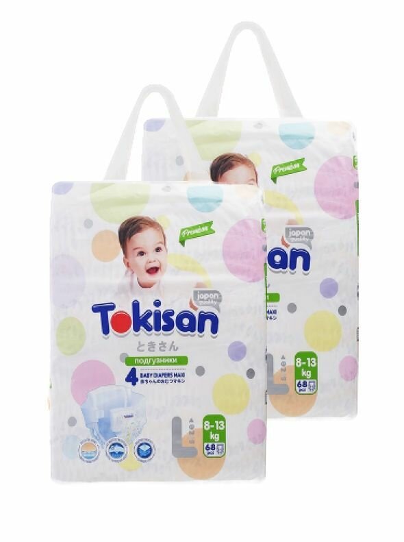 Купить Подгузники детские Tokisan Premium MAXI L для малышей 8-13 кг, 4 размер, 136 шт, дневные (ночные) с индикатором, одноразовые дышащие для детей, девочек и мальчиков / набор (2 упаковки по 68 шт)