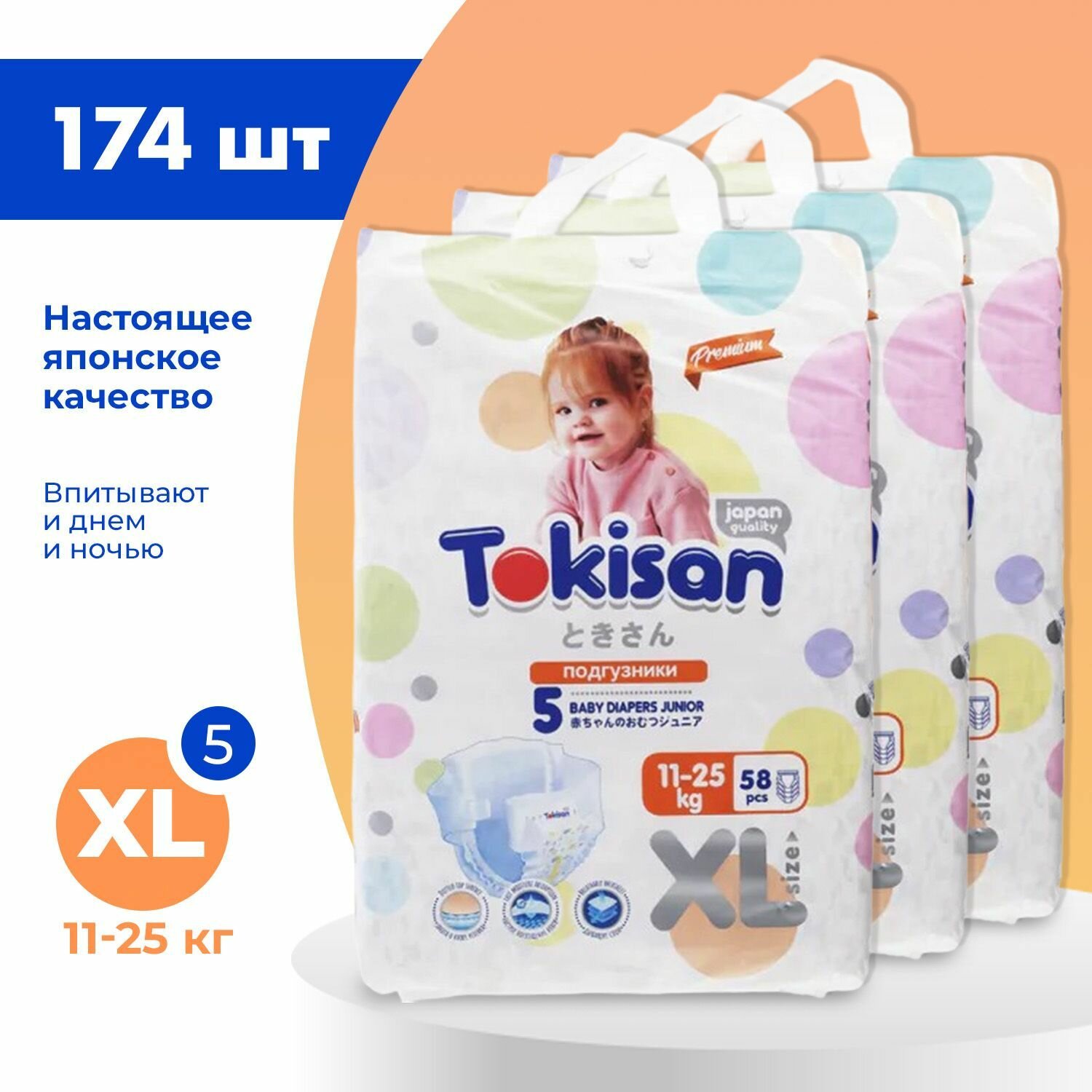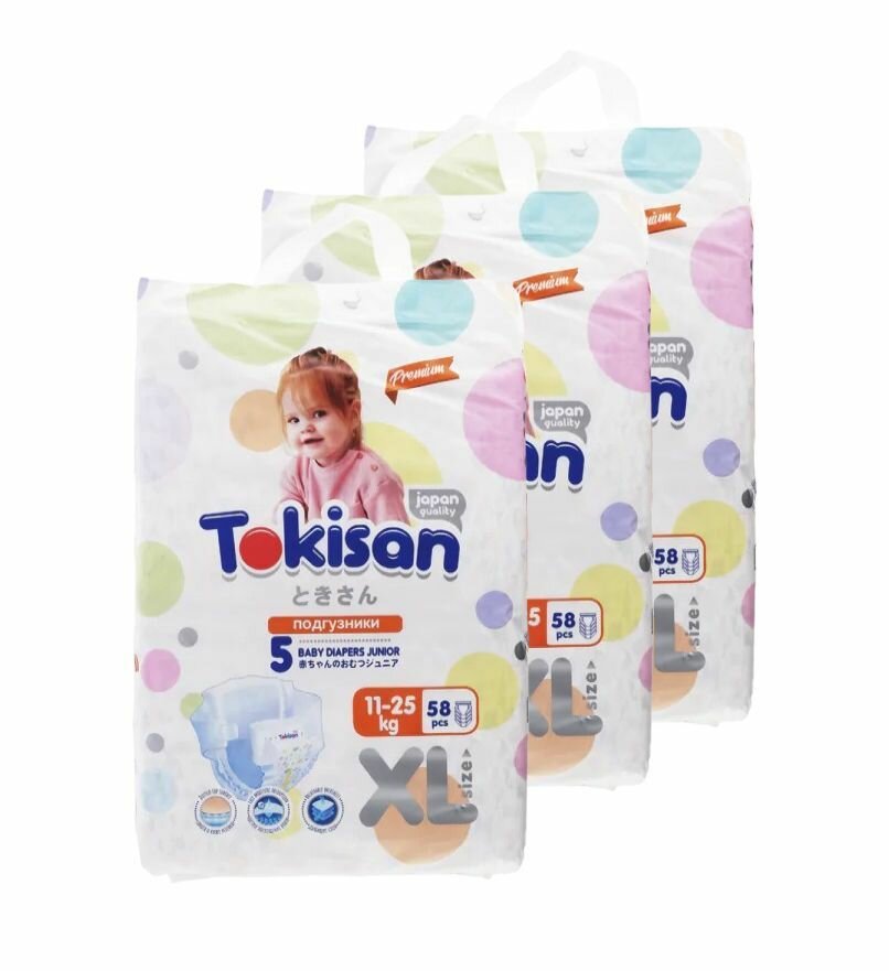 Купить Подгузники детские Tokisan Premium JUNIOR XL для малышей 11-25 кг, 5 размер, 174 шт, дневные (ночные) с индикатором, одноразовые дышащие для детей, девочек и мальчиков / набор (3 упаковки по 58 шт)