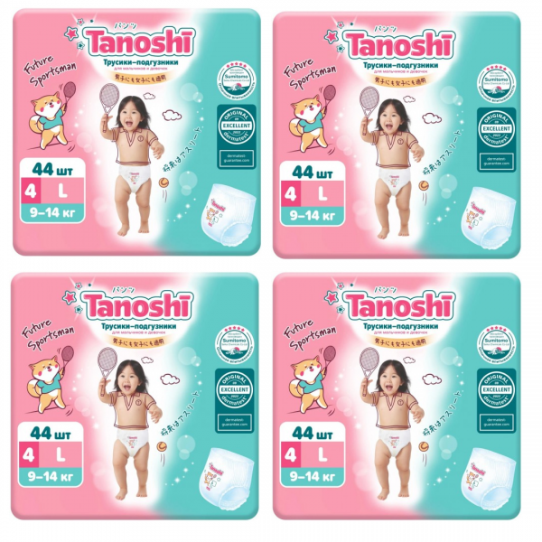 Подгузники-трусики Tanoshi Premium, размер L / 4 (9-14 кг) 44 шт., мягкие и тонкие