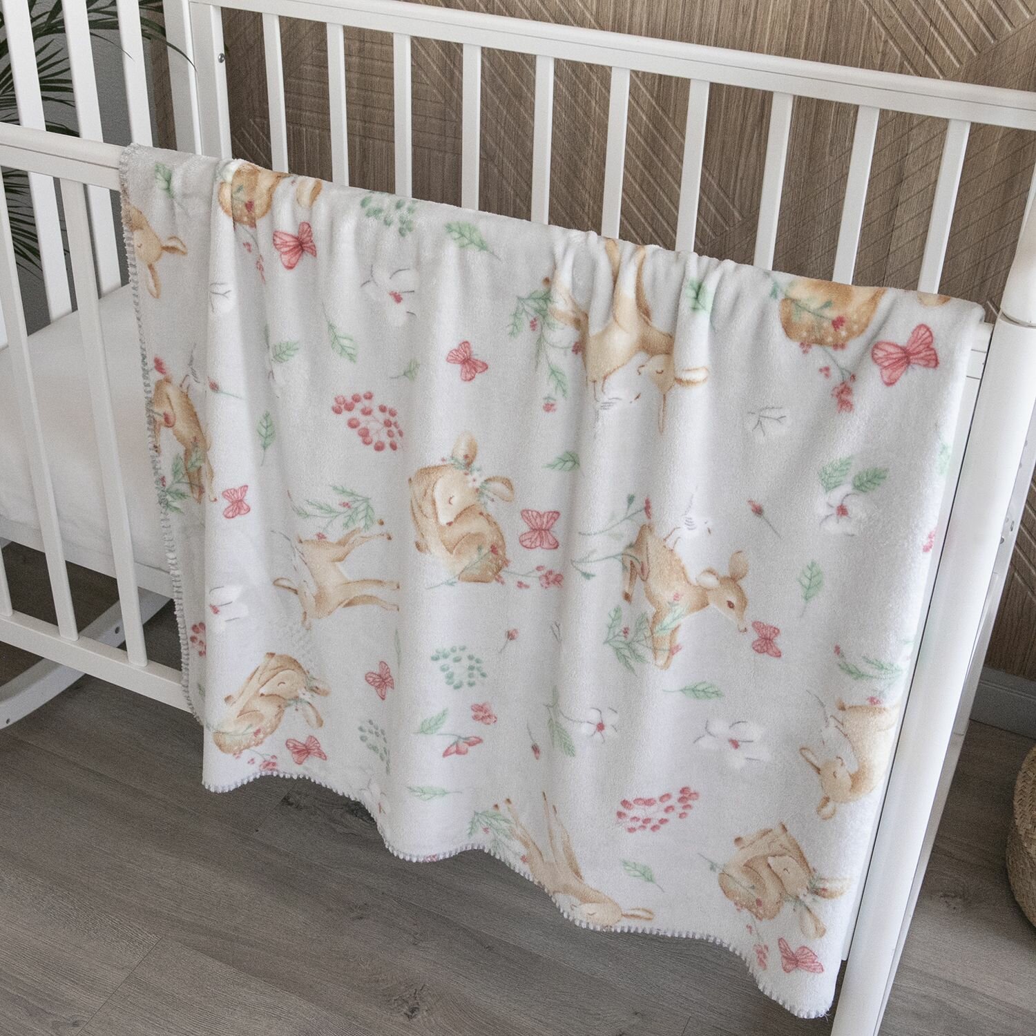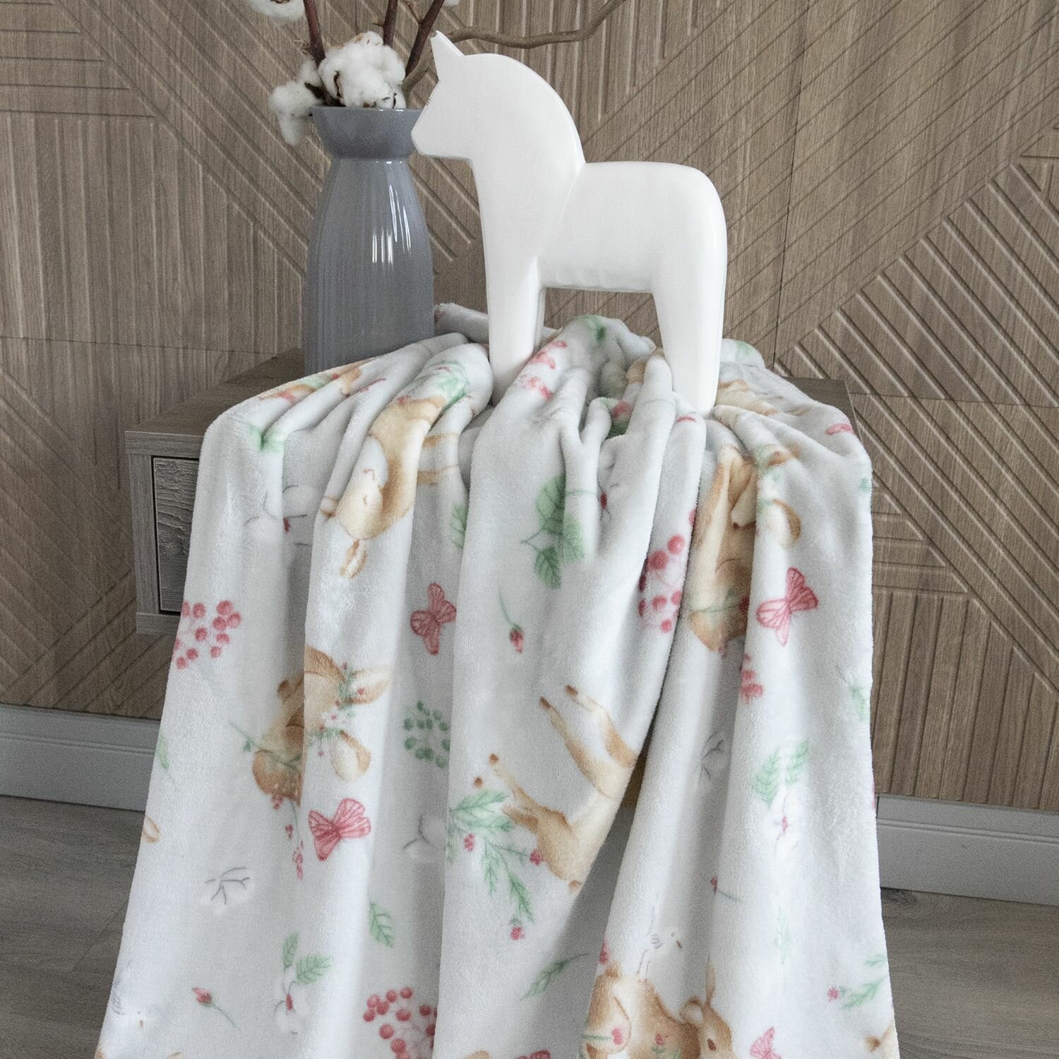 Плед детский для новорожденных в кроватку, коляску плюшевый и мягкий 100х150 см "Зайки на белом"