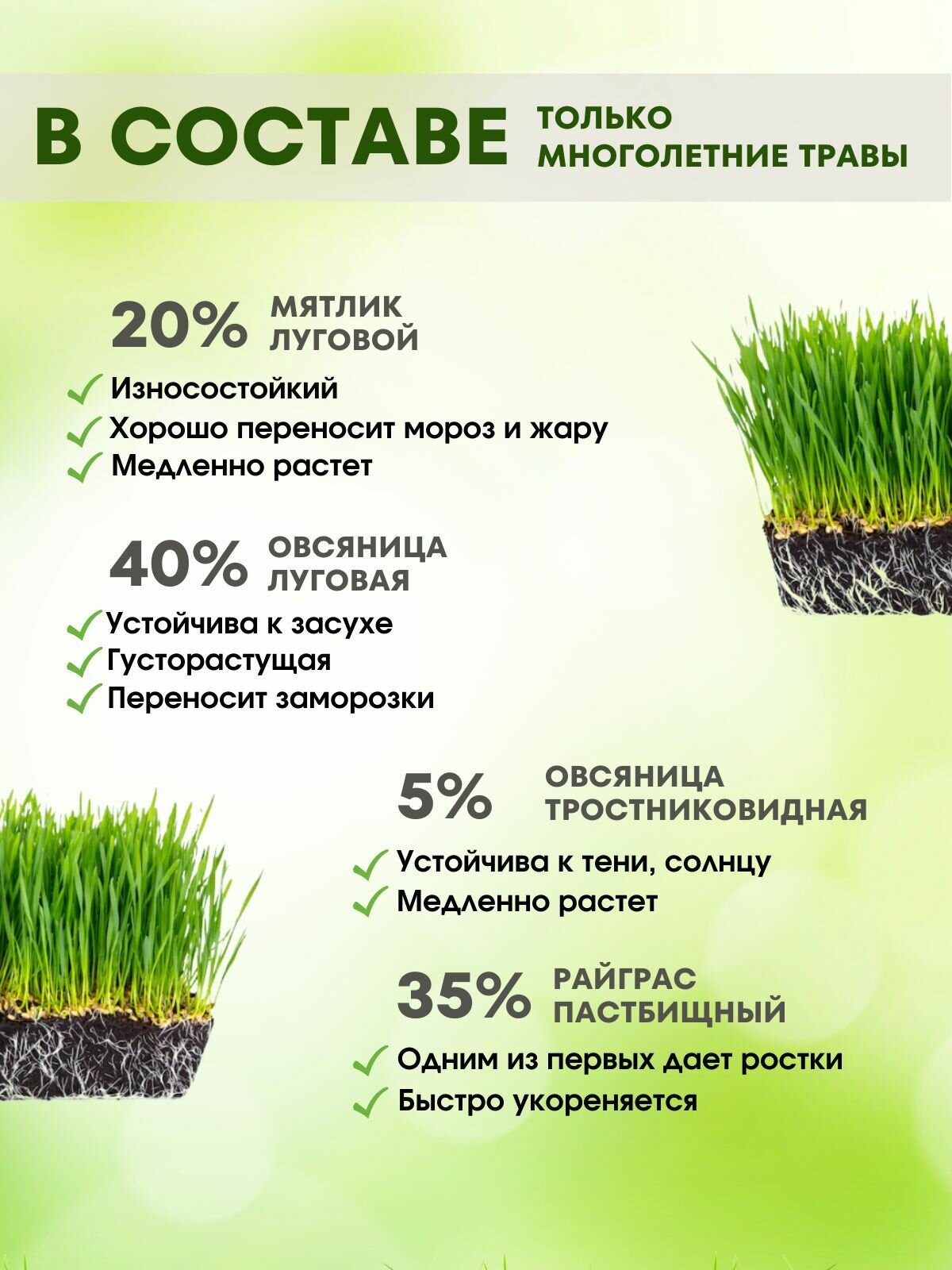 | Трава | мятлик / овес / овсяница / овсяница красная / райграс |