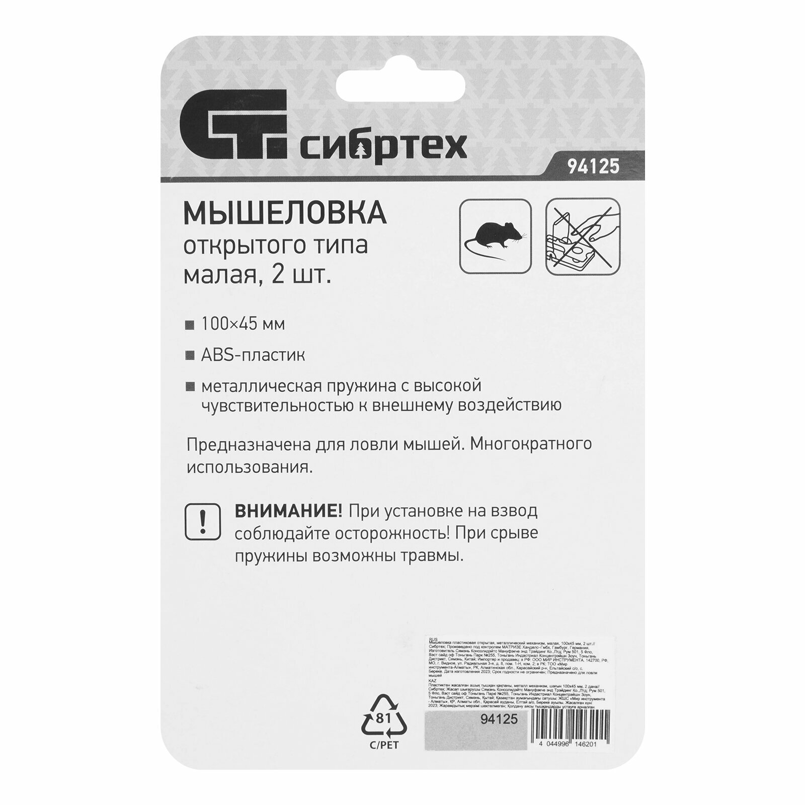 Мышеловка пластиковая открытая Сибртех металлический механизм, малая, 100х45 мм, 2 шт 94125 интересное: