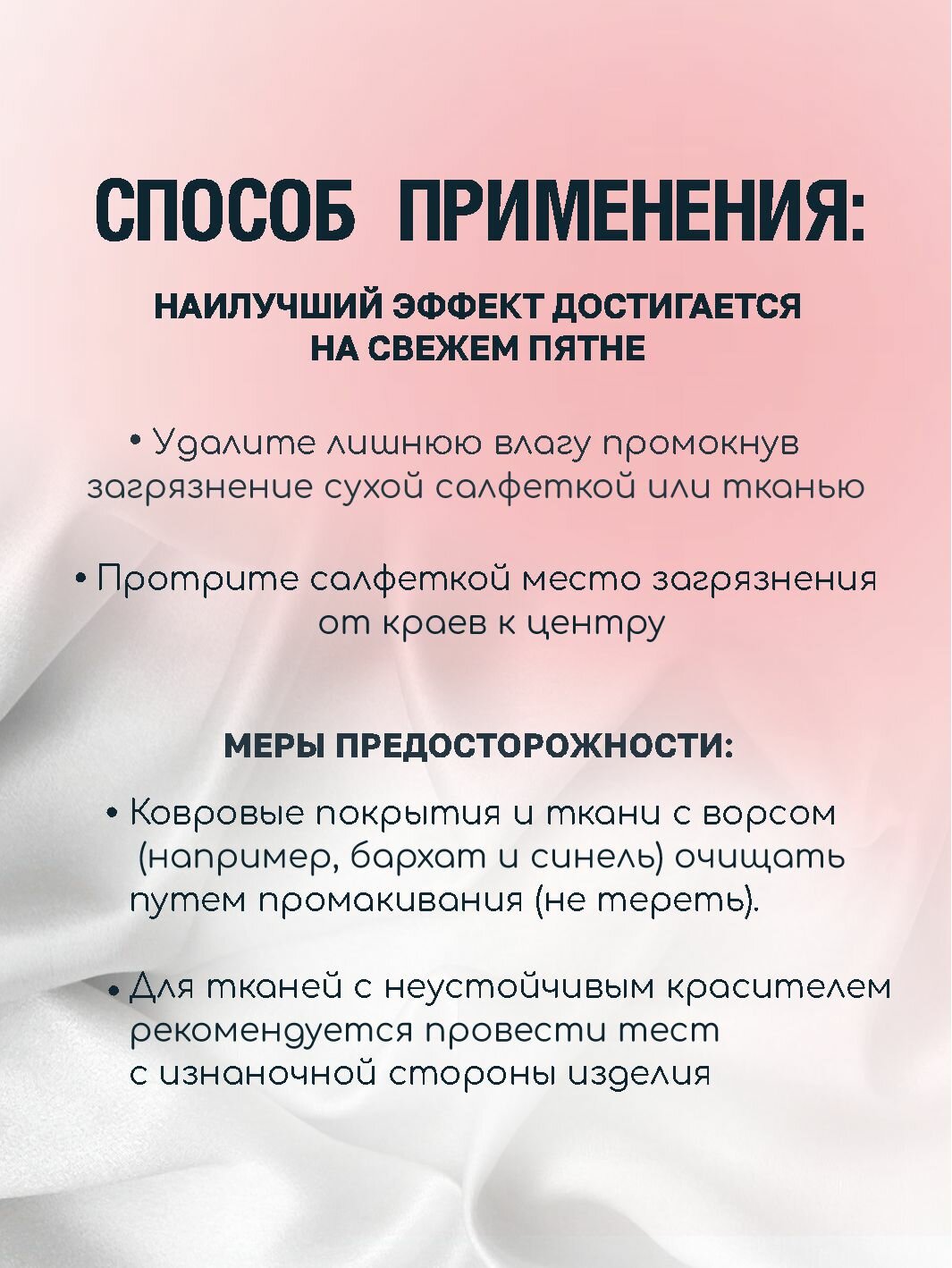 | Способ применения | Рекомендуется предварительно промокнуть салфеткой незаметный участок ткани на неиспачканной одежде, чтобы проверить как салфетка взаимодействует с вашим изделием. Протрите место загрязнения от краев к центру, удалите лишнюю влагу сухой салфеткой или тканью. Наилучший эффект будет достигнут на свежем пятне. |
