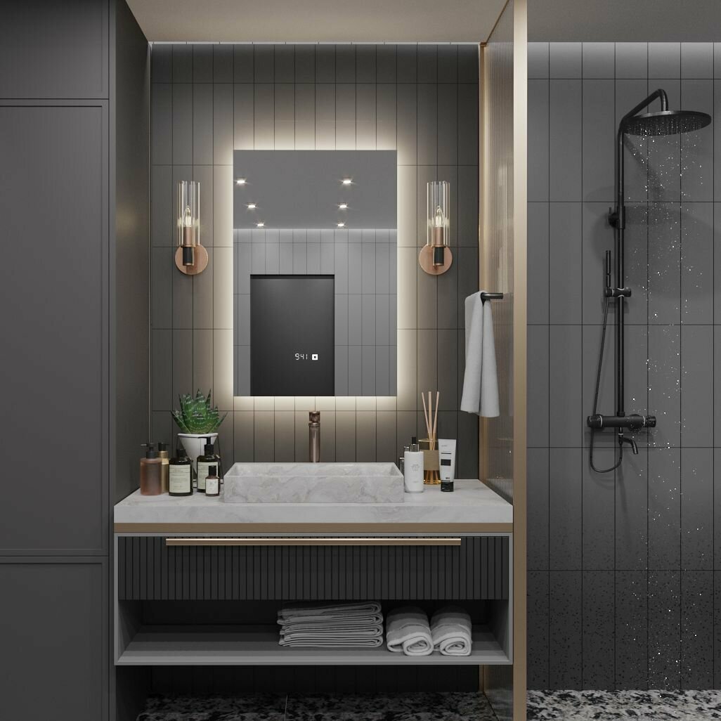Зеркало в ванную с подсветкой настенное Alias Квартал 80*100 для ванной с нейтральной LED-подсветкой и часами, сенсорная кнопка