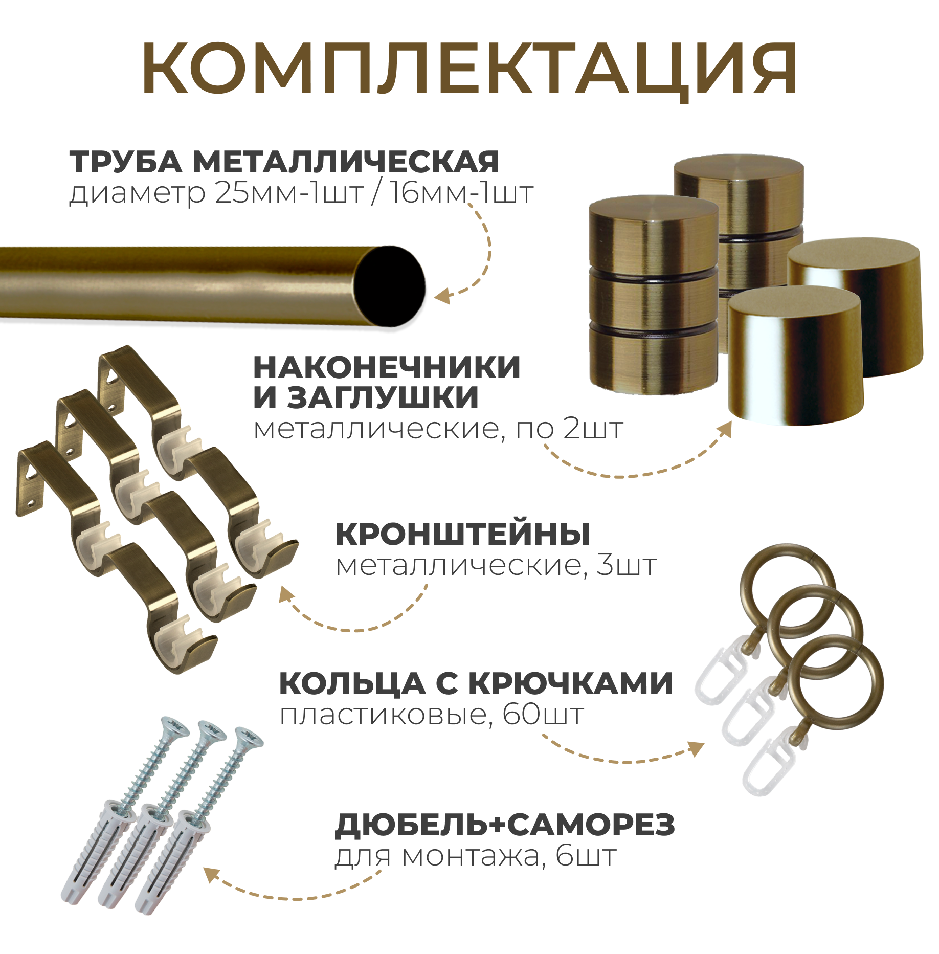 | Комплектация | Труба металлическая с наконечником, кольца, крючки для колец, кронштейн, дюбели, саморезы. |