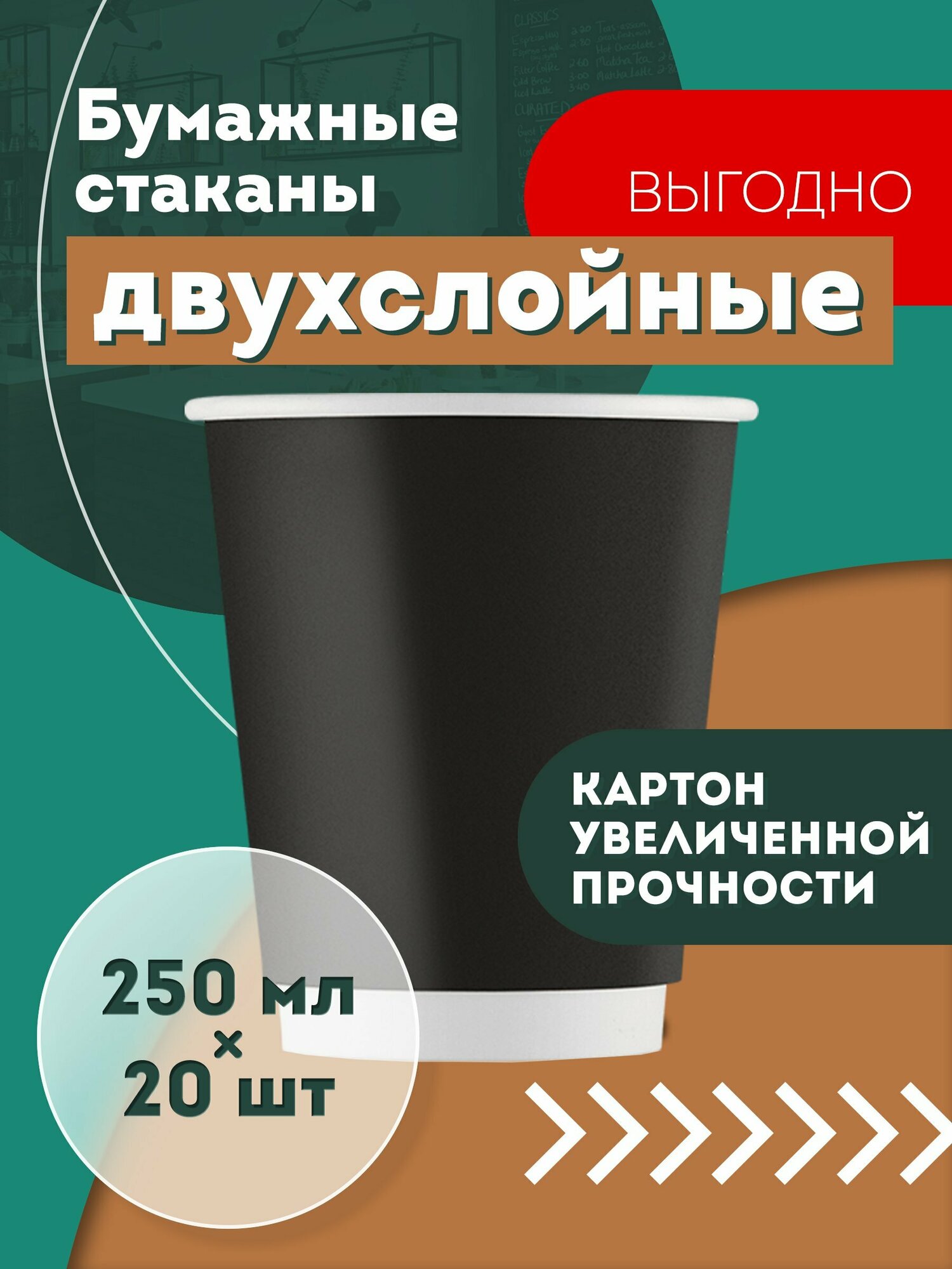 Набор одноразовых бумажных стаканов, 250 мл, 20 шт, чёрные, двухслойные; для кофе, чая, холодных и горячих напитков интересное: