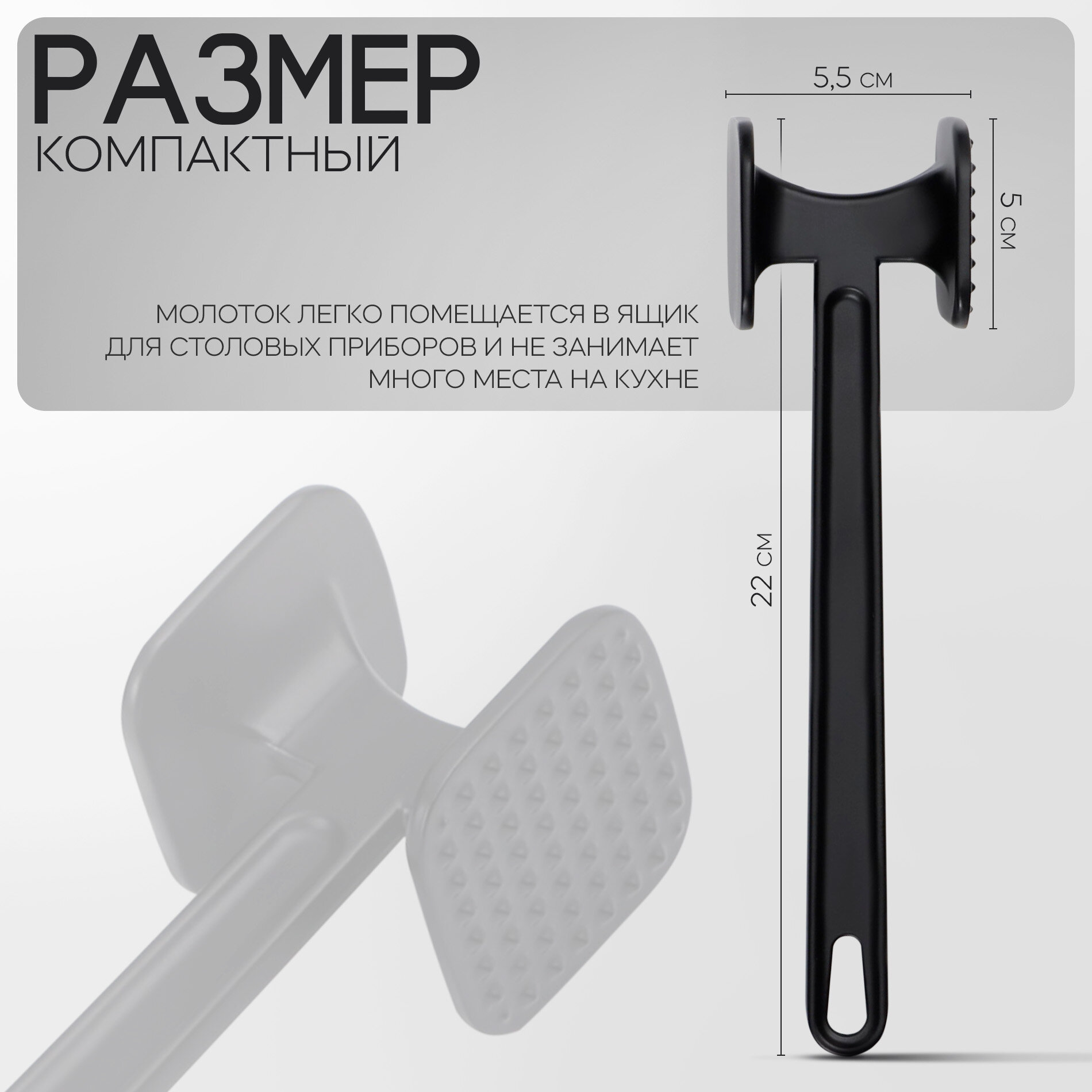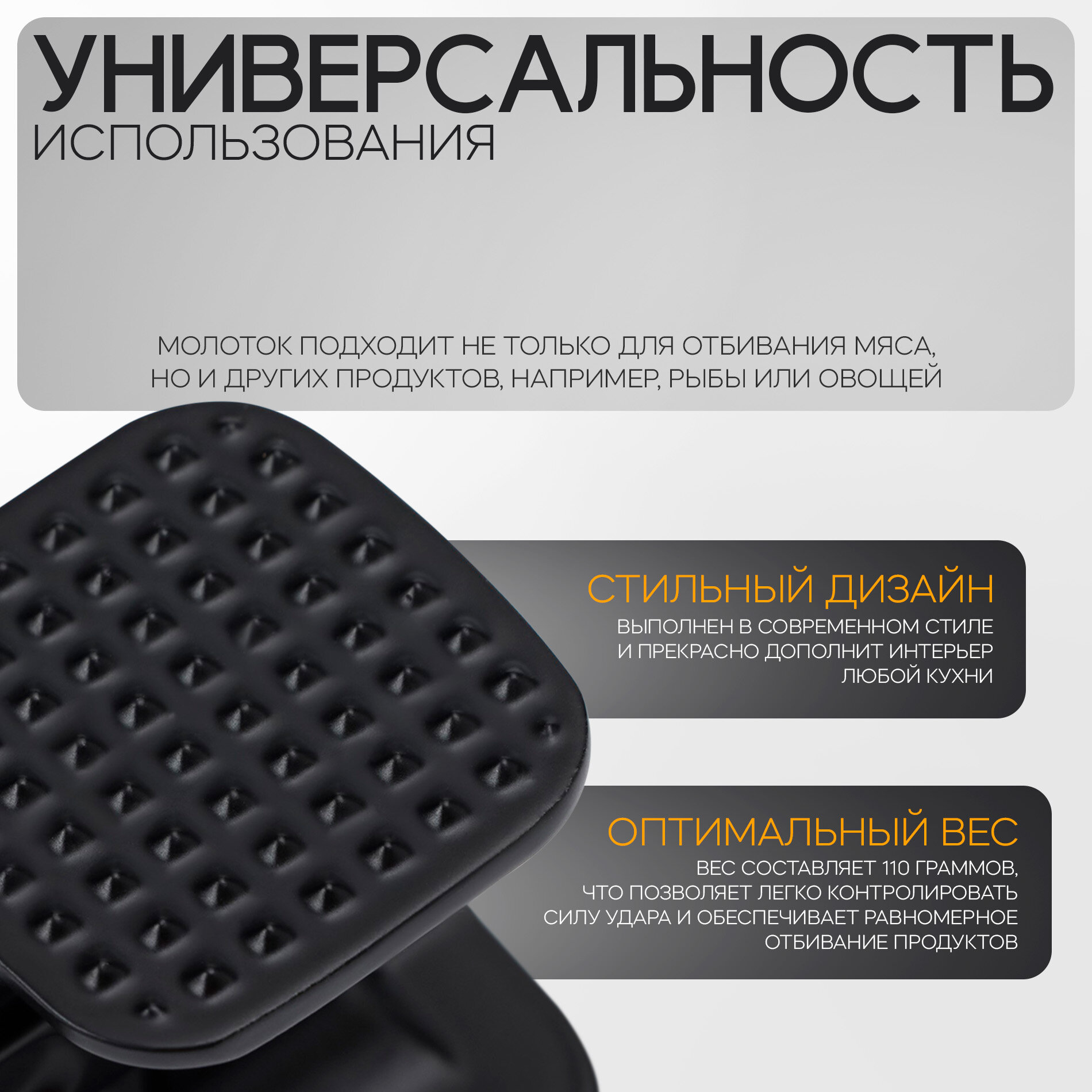 | Дополнительная информация | Молоток изготовлен из прочного алюминия, который гарантирует его долговечность и надежность. Молоток подходит не только для отбивания мяса, но и для других продуктов, например, рыбы или овощей. |
