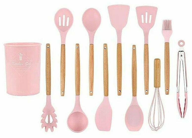 Набор кухонных принадлежностей из бука и силикона, 12 предметов - розовый интересное: